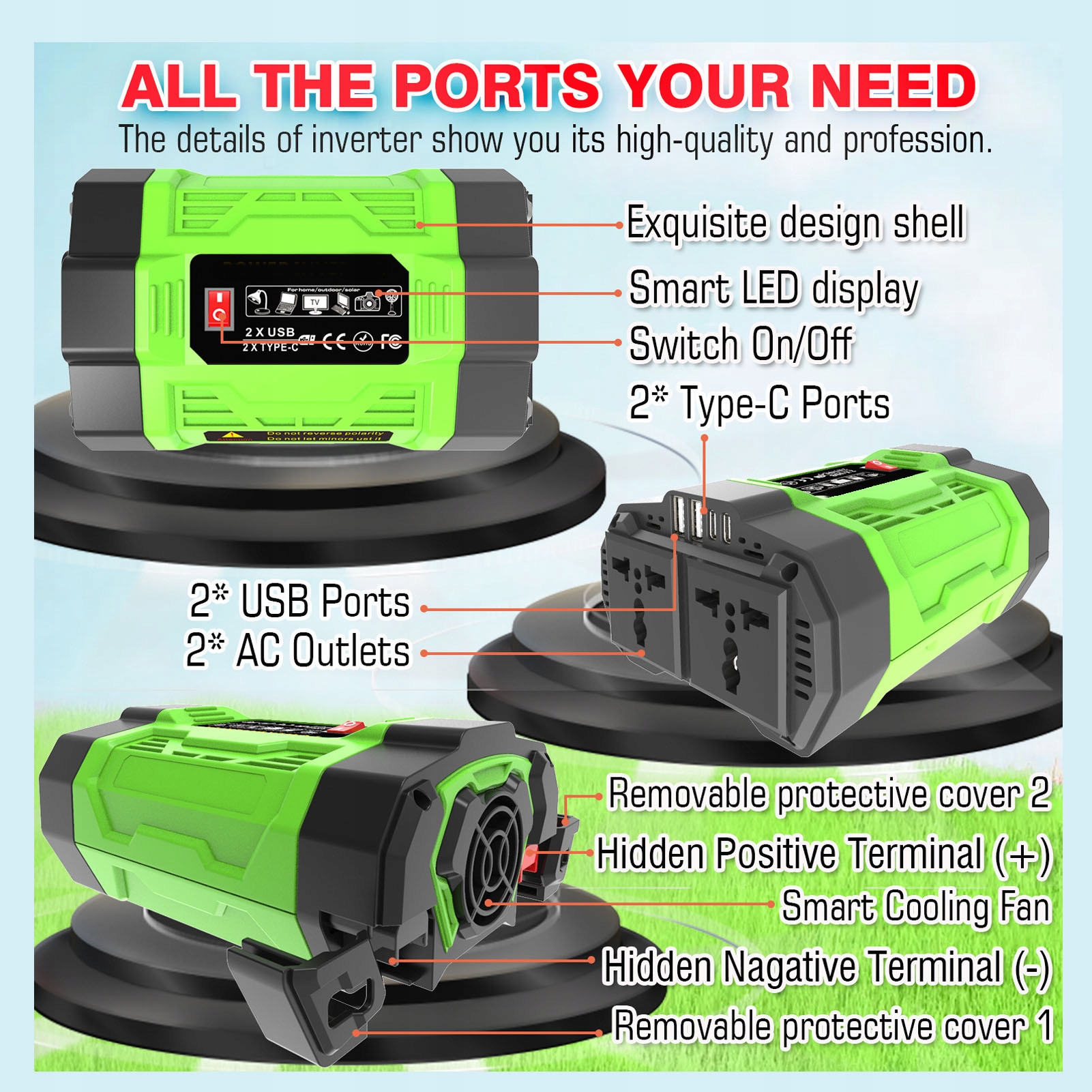 3. Премиальная конструкция из АБС-пластика: этот инверторный преобразователь, изготовленный из высококачественного АБС-материала и оснащенный функцией преобразования 12 В в 220 В, надежен и широко совместим с различными потребностями в электропитании.