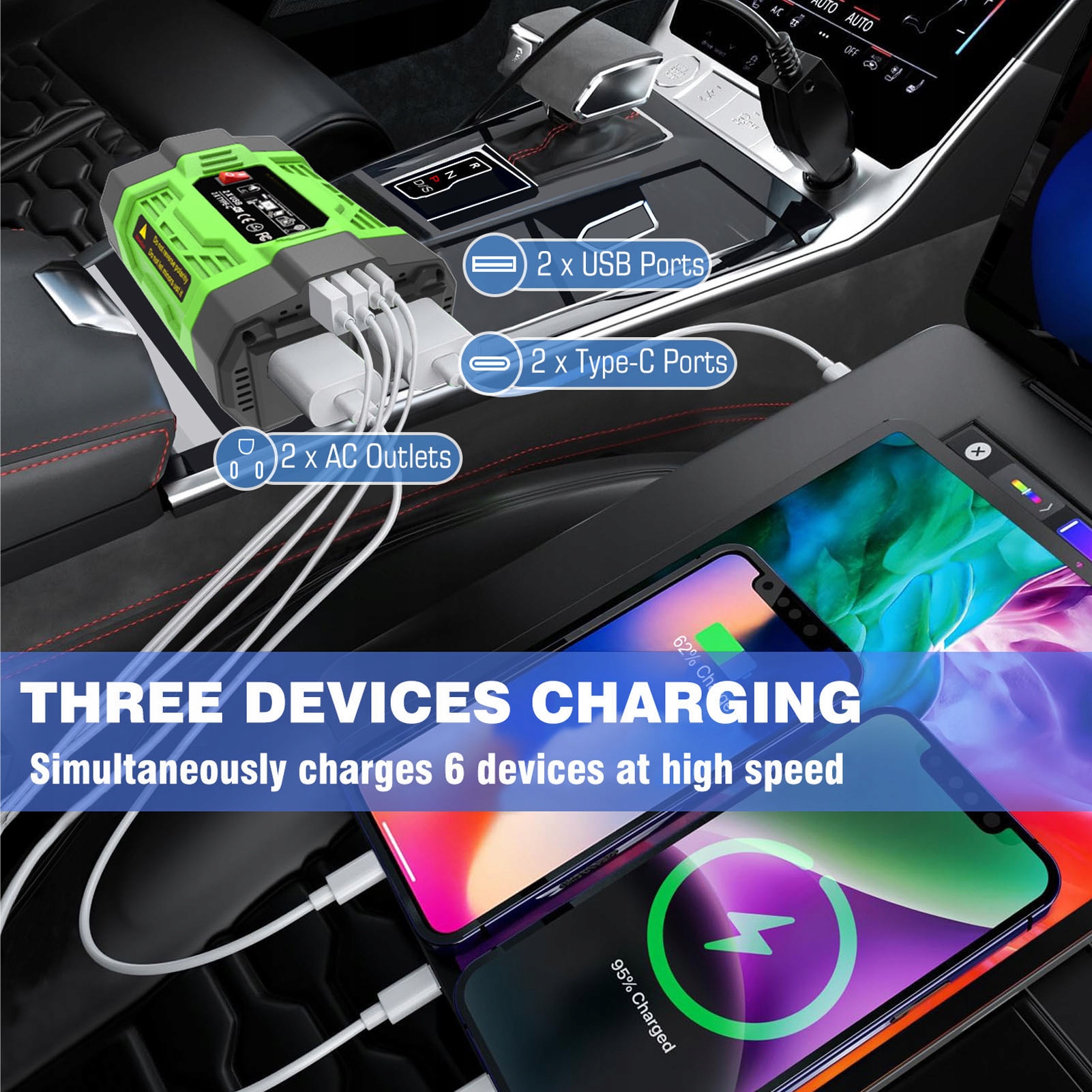 1. Высокая выходная мощность 200 Вт. Благодаря стабильной выходной мощности 200 Вт автомобильный инвертор может эффективно заряжать различные электронные устройства, включая ноутбуки, смартфоны и другие гаджеты, в дороге.