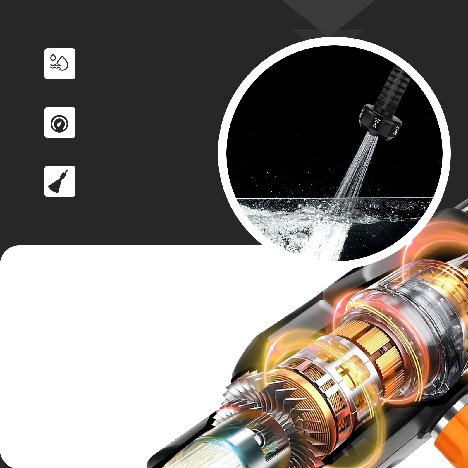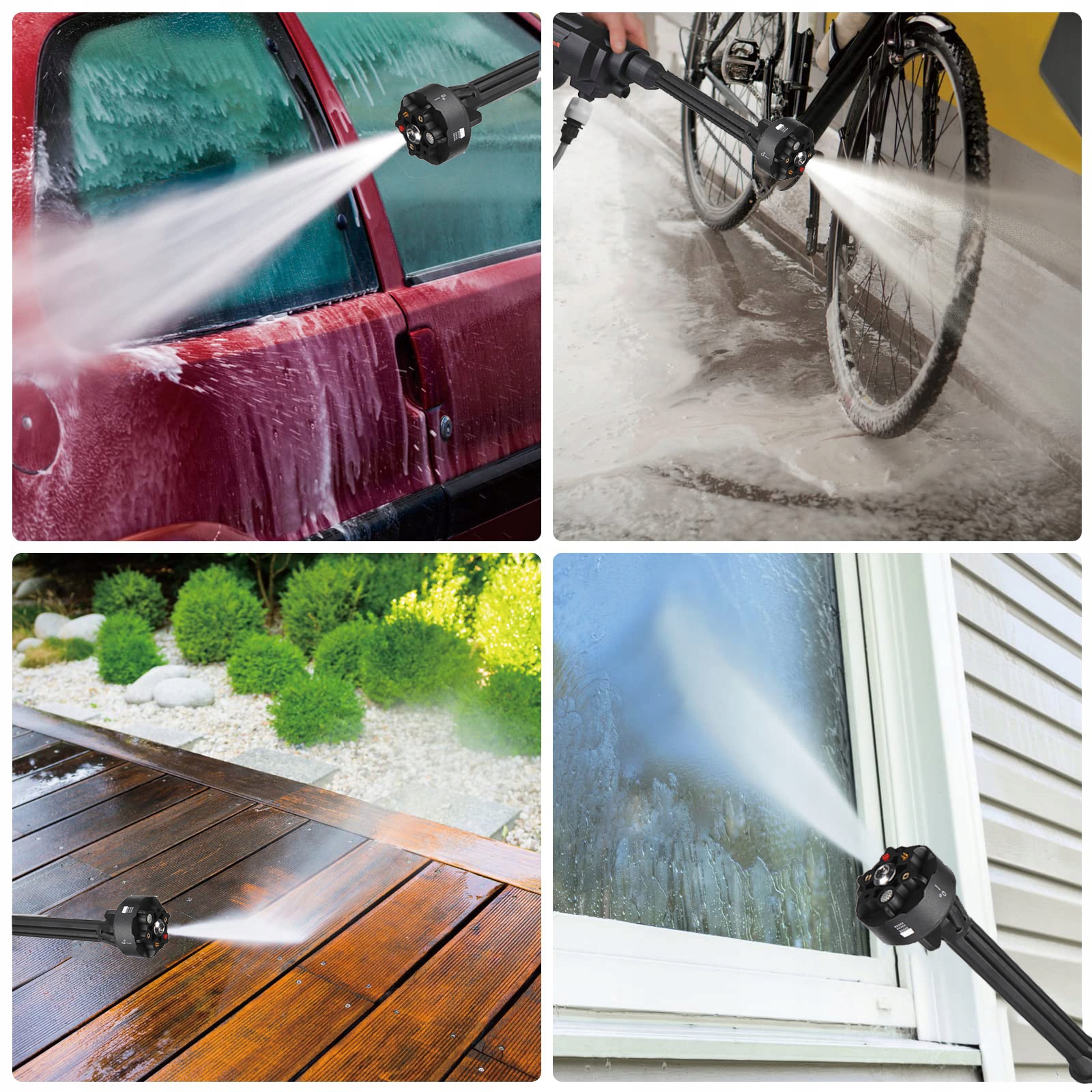 Несколько сопла 6 в 1 предлагает различные схемы распыления, включая 0 °, пенопластовый поток, 40 °, а также 3#110 ° или 4#110 ° и поток для душа, что обеспечивает гибкость для различных чистящих досок. Кроме того, быстрое пенопластовое резервуар помогает быстро удалить пятна и обеспечить сияющую отделку