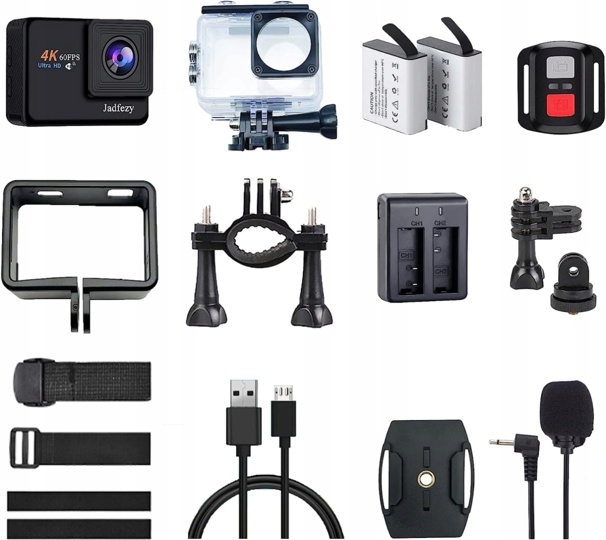 Jadfezy Action Cam 4K 60 кадров в секунду со стабилизацией изображения EIS, Wi-Fi и дистанционным управлением, спортивная камера 24 МП с 8-кратным зумом, подводная камера 30 Мп с двумя батареями емкостью 1500 мАч и аксессуарами для крепления