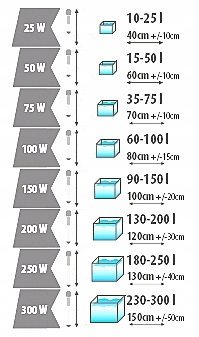 Мощность нагревателя следует выбирать в зависимости от типоразмера. аквариума, чтобы поддерживать температуру на должном уровне.