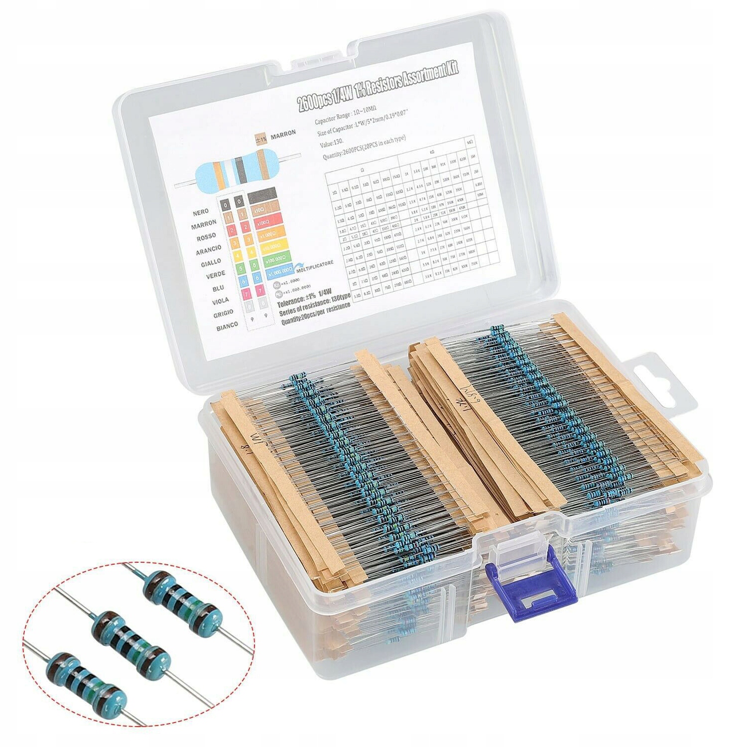 НАБОР РЕЗИСТОРОВ 2600ШТ 1/4ВТ СОПРОТИВЛЕНИЕ 0,25ВТ 20Х130ШТ + КОРОБКА