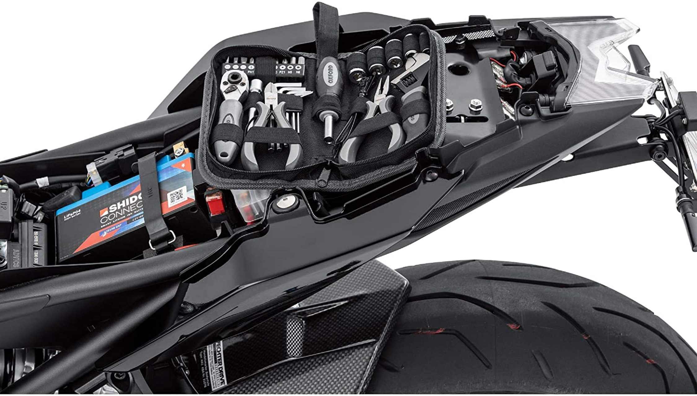 Необходимый набор мотоциклиста Oxford Toolkit Pro состоит из 27 элементов. Диван в мотоцикле.