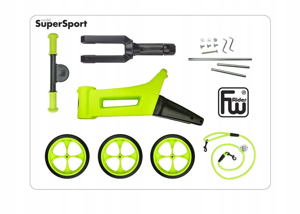 Велосипед обладает возможностью регулировать элементы регулировки высоты - 2 на обеих осях, для детей меньшего и более крупного. Разработанные колеса (тип без воздушных) с мягкой пневматикой обеспечивают тихое вождение и не оставляют никаких следов на полу. Рулевое колесо оснащено разноцветными, очень мягкими ручками, которые расширяются на концах, чтобы защитить руки детей от травм. Кроме того, вилка рулевого колеса имеет встроенную блокировку, ограничивающую объем ее вращения, что предотвращает животик ребенка. Велосипед FW Super Rider был разработан в консультации с ортопедическими хирургами. Он изготовлен из долговечного и безобидного пластика с герметичными разъемами.