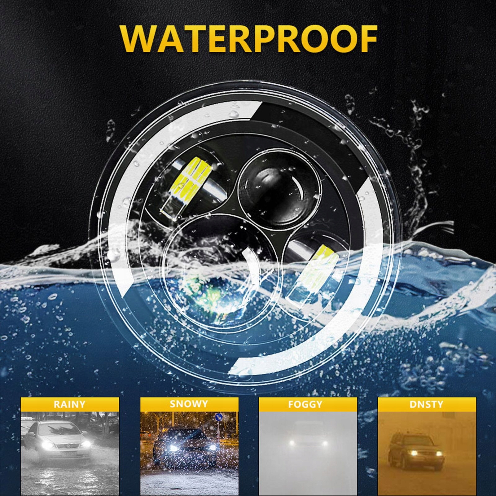 - Эта 7-дюймовая светодиодная фара с белым дальним/ближним светом, указателями поворота ДХО и желтым светом очень яркая и долговечная.