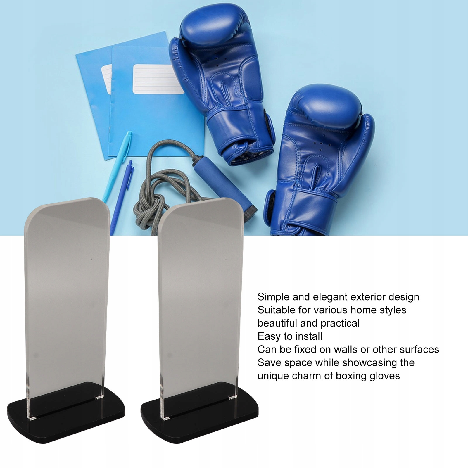 Особенность:1. Акриловый материал: подставка для боксерских перчаток изготовлена из акрилового материала, который прочный и надежный и может долго демонстрировать ваши боксерские перчатки.