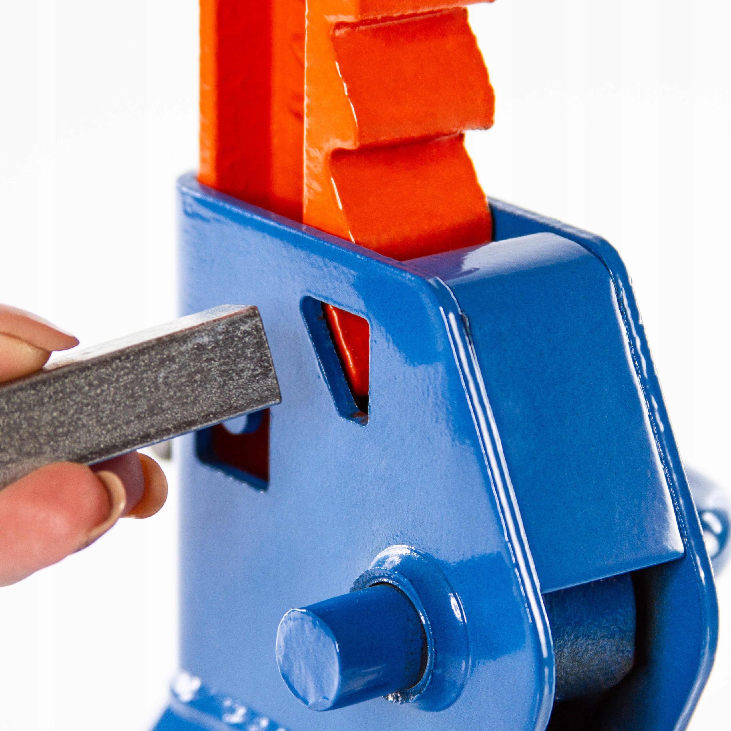 - Специальный дополнительный замок в виде штифта защищает храповой механизм от непреднамеренного опускания опорной стойки. Штифт оснащен стальным тросом, прикрепленным к корпусу эстакады, который предохраняет его от потери.