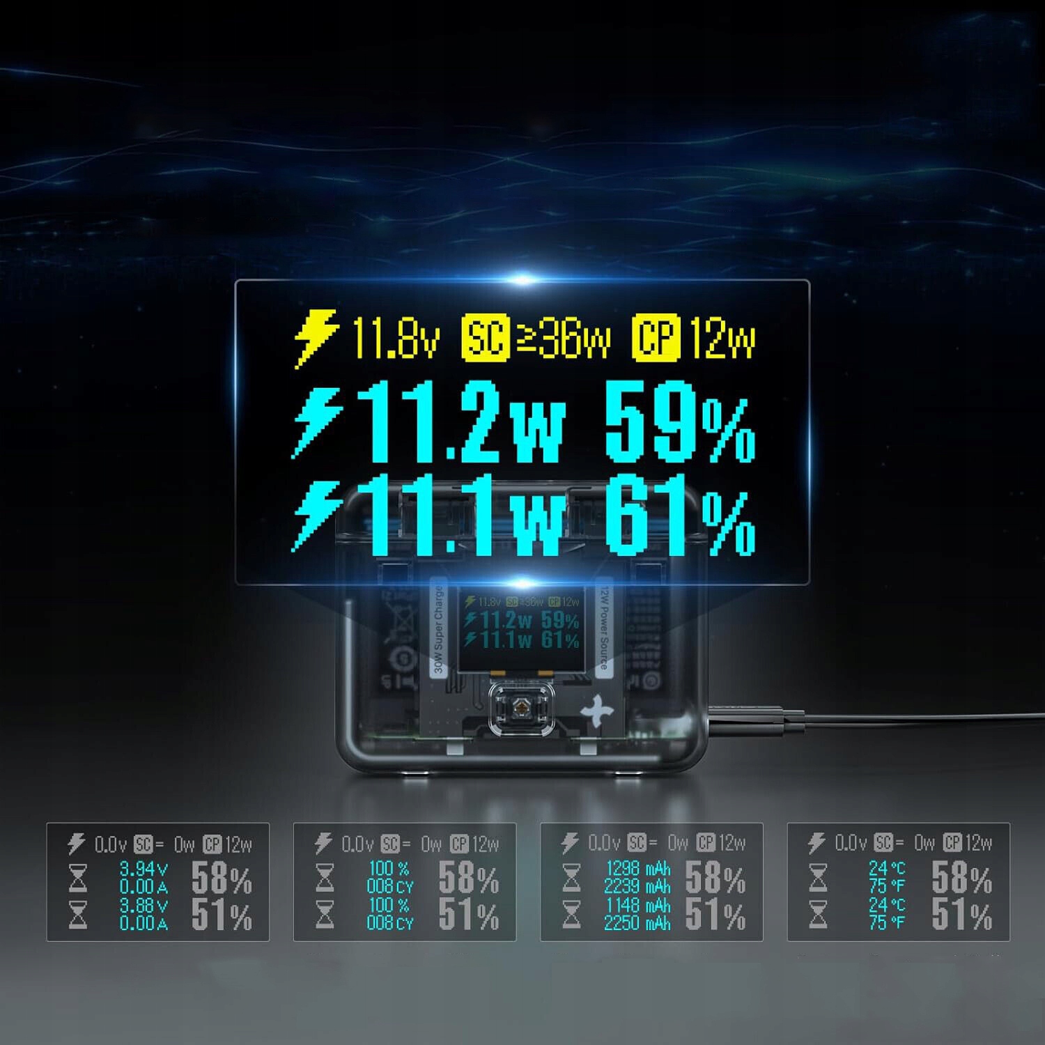 - Отображает всю информацию об аккумуляторе и зарядке: состояние зарядки, мощность зарядки/разрядки, напряжение, ток , состояние батареи, количество циклов, полезная емкость, полная емкость зарядки, температура в градусах Цельсия и Фаренгейта, а также мощность (доступная мощность)