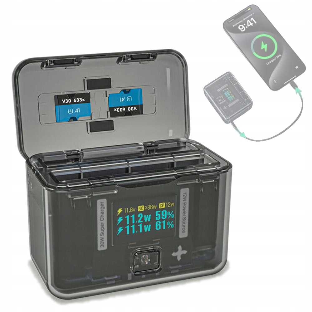 - Три в одном Умный чехол для зарядки: ☁️двухканальный концентратор быстрой зарядки, ☁️портативный преобразователь питания и ☁️органайзер для аккумулятора, три функции в одной.