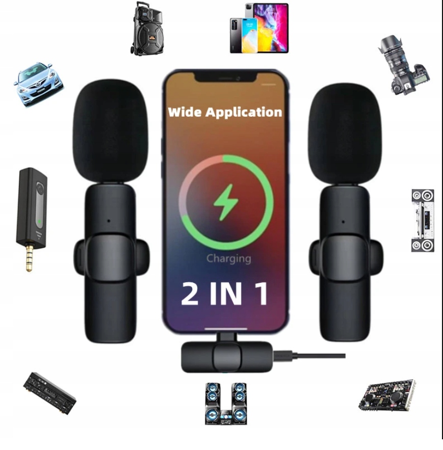 Беспроводной микрофон состоит из двух частей: одна — передатчик микрофона, другая — приемник. Его можно использовать для прямых онлайн-трансляций, записи видеоблогов, программных интервью, записи, видеообучения и других целей.