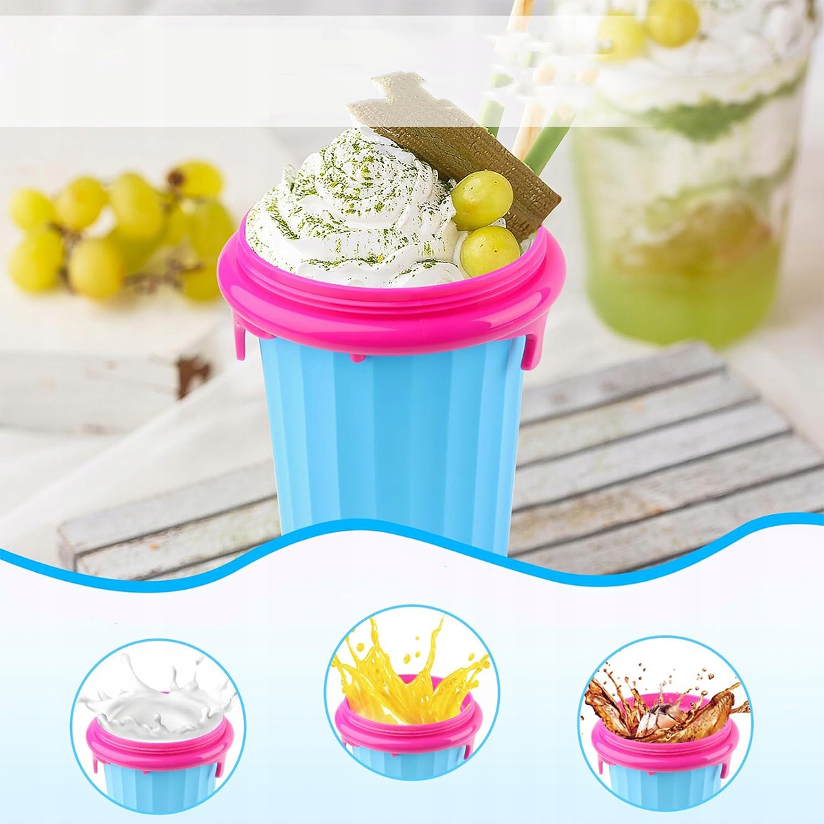 Чашки для смузи изготовлены из пищевого силикона, ТПУ и ПП, они не деформируются и не повреждаются, имеют длительный срок службы. Чашка плотно закрывается и не протекает. Можно мыть и использовать повторно. Просто вымойте кружку водой (обратите внимание: ее нельзя стирать в машине!), затем снова заморозьте ее, и вы сможете снова использовать ее, чтобы снова почувствовать прохладу. Он очень подходит для взрослых и детей.