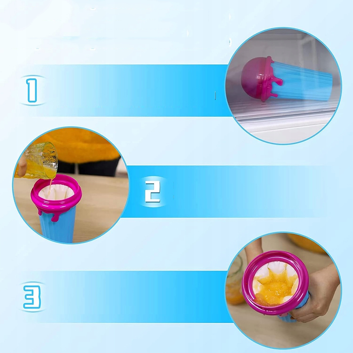 Шаг 1: заморозьте чашку примерно на 1 минуту. 3-6 часов, пока стаканчики для мороженого не замерзнут (чашки затвердеют). Тем временем поставьте выбранный напиток, сок или лимонад в холодильник. Шаг 2: Достаньте чашку для смузи из холодильника. Налейте любимый напиток и закройте крышку. Шаг 3: Просто поднесите чашку ко рту и подержите 1–3 минуты. Пожалуйста, время от времени помешивайте.