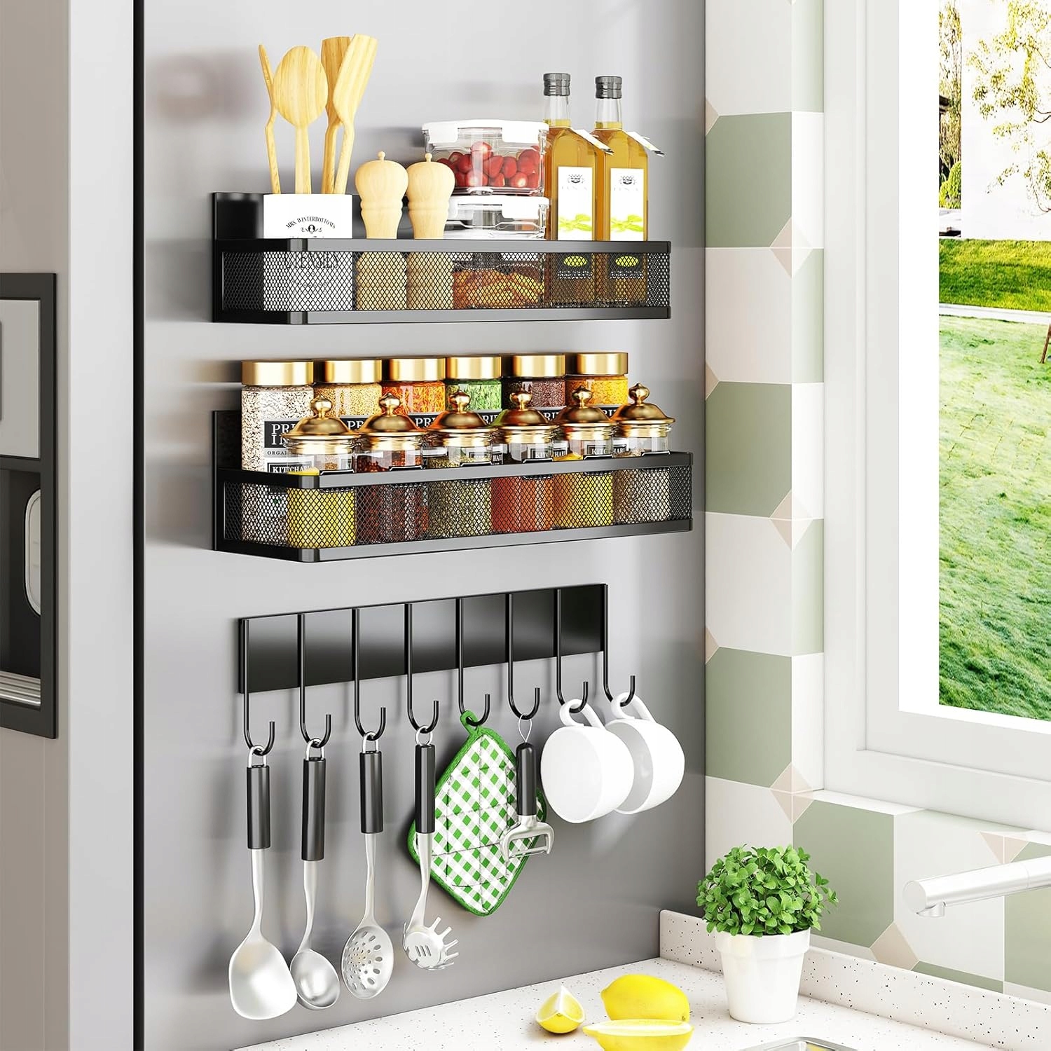 Miyawell — Магнитная полка для специй • 3 шт. • Металлический органайзер для холодильника с 8 крючками