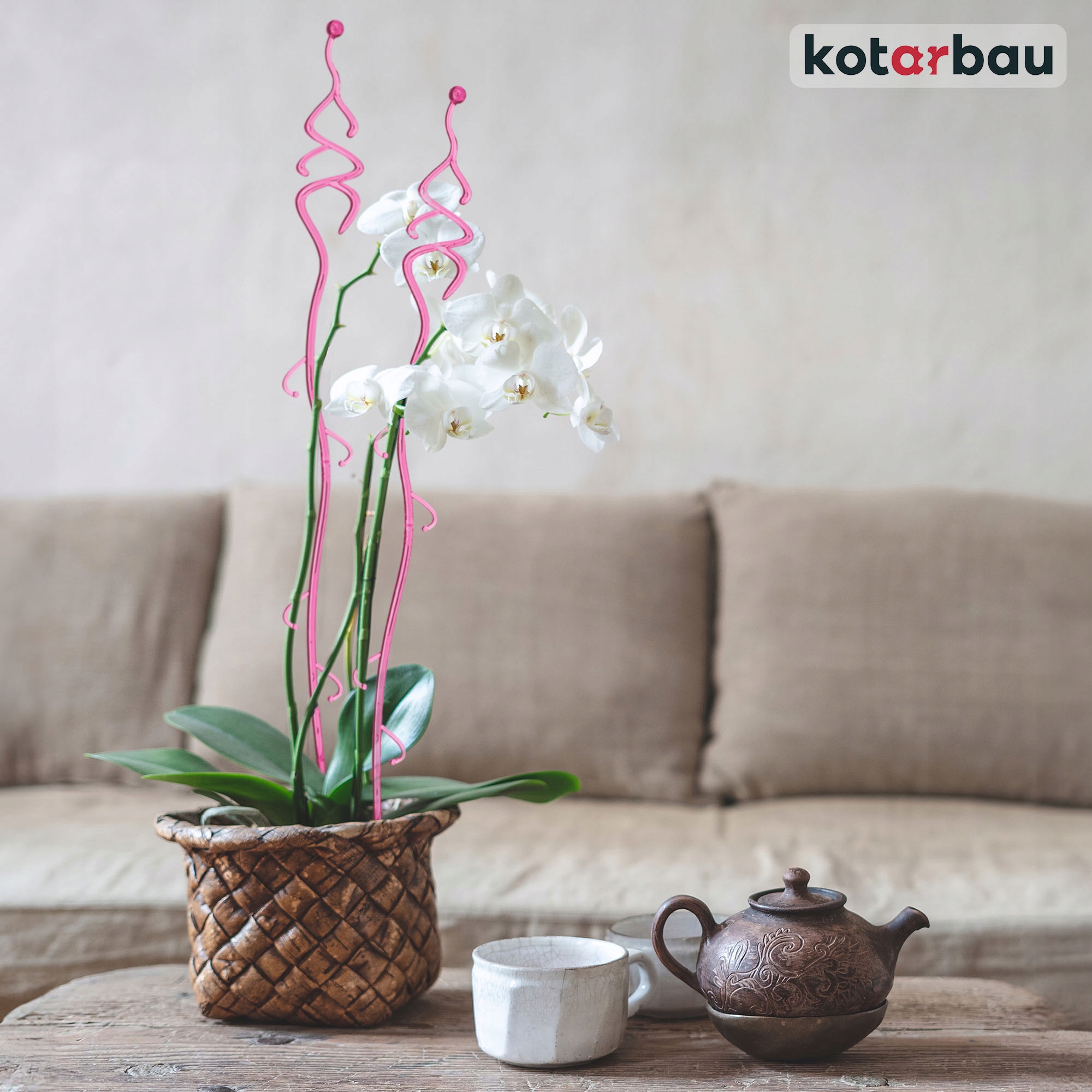 Подставка для цветов розовая и прозрачная, поэтому практически незаметна и никоим образом не перегружает растение или композицию. Он не нарушает эстетику цветов, а даже подчеркивает ее благодаря своей причудливой форме, имитирующей растение.