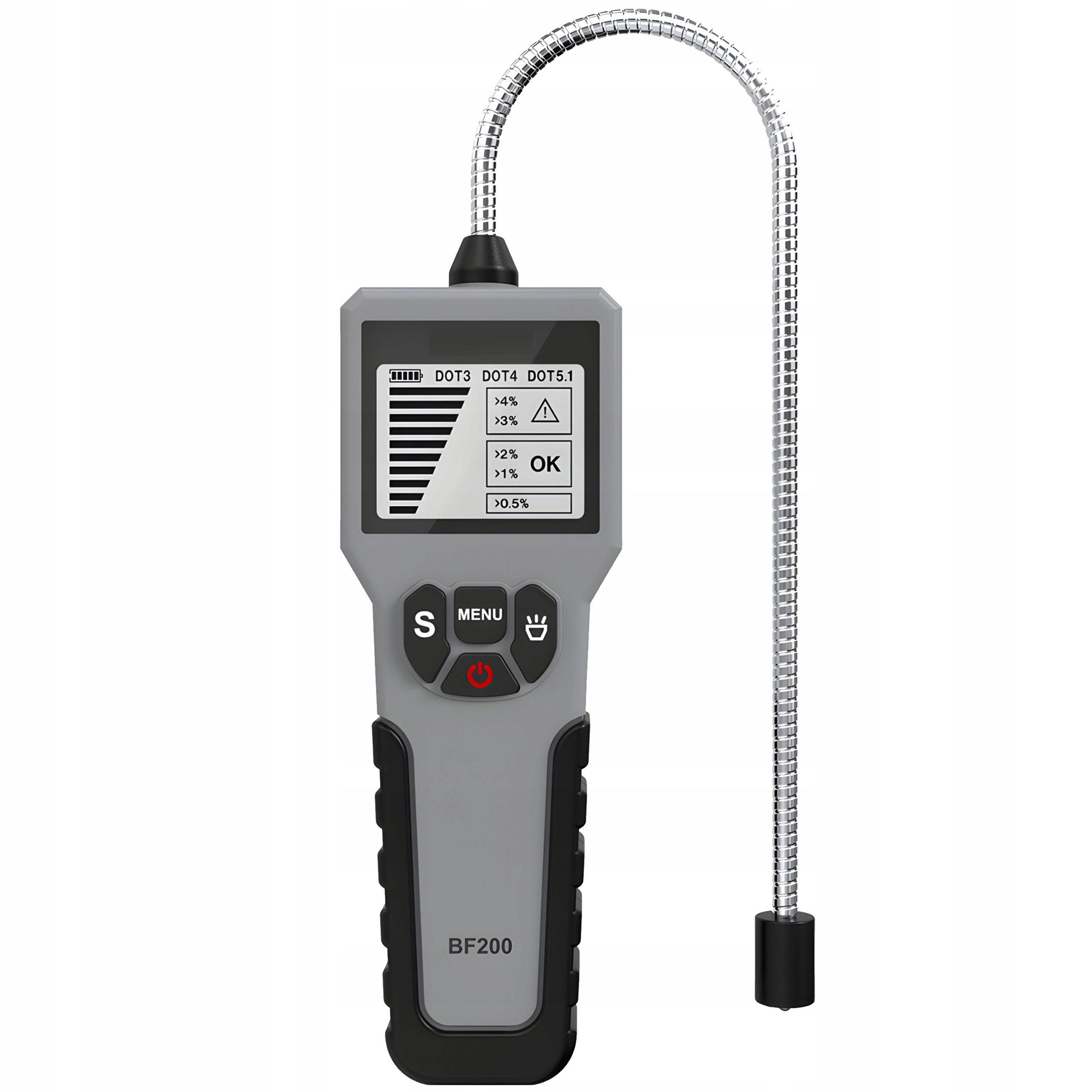 Этот профессиональный тестер тормозной жидкости был разработан для точности и скорости определения состояния тормозной жидкости. Оснащенный усовершенствованным, гибким и исключительно чувствительным датчиком, он обеспечивает мгновенные и точные показания. Зонд, напоминающий гибкую шею, обеспечивает непревзойденную гибкость в процессе обнаружения, делая всю процедуру намного проще и быстрее.