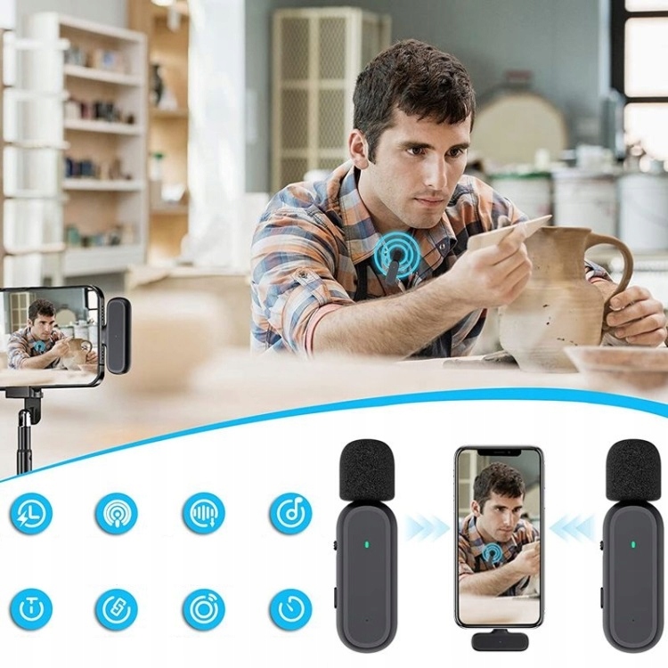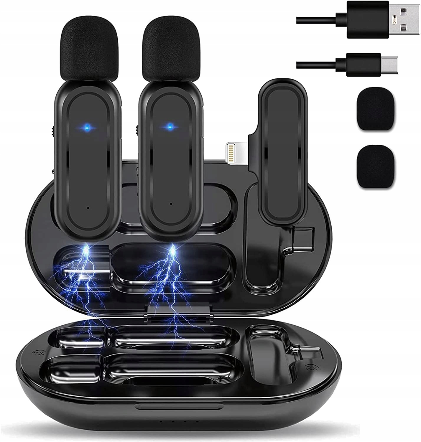 В комплект входят 2 беспроводных микрофона, приемник с 8PIN-портом, совместимый с iPhone и iPad, и чехол с беспроводной зарядкой. Радиус действия микрофонов составляет 20 метров. Это идеальное решение для мероприятий, отчетов, презентаций, видеоконференций и профессиональной видеозаписи. Беспроводная технология делает сигнал сильнее и чище, а микрофоны также имеют систему шумоподавления, которая снижает шум в сигнале.