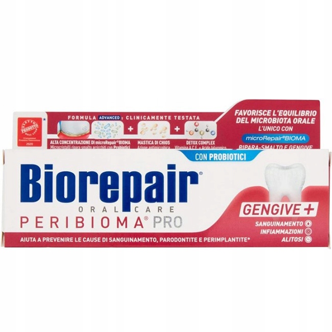 Зубная паста Biorepair Peribioma предотвращает кровоточивость десен и заболевания пародонта, которые вызывают бактерии, размножающиеся в полости рта. Использование пробиотиков предотвращает разрушение зубов, поскольку они подавляют рост болезнетворных бактерий. Микронизированные кристаллы, содержащиеся в пасте, восстанавливают зубную эмаль. Фисташковая смола, содержащаяся в пасте, обладает антибактериальными свойствами. Зубная паста Biorepair Peribioma – продукт, содержащий детоксицирующий комплекс, регенерирующий ткани десен.
