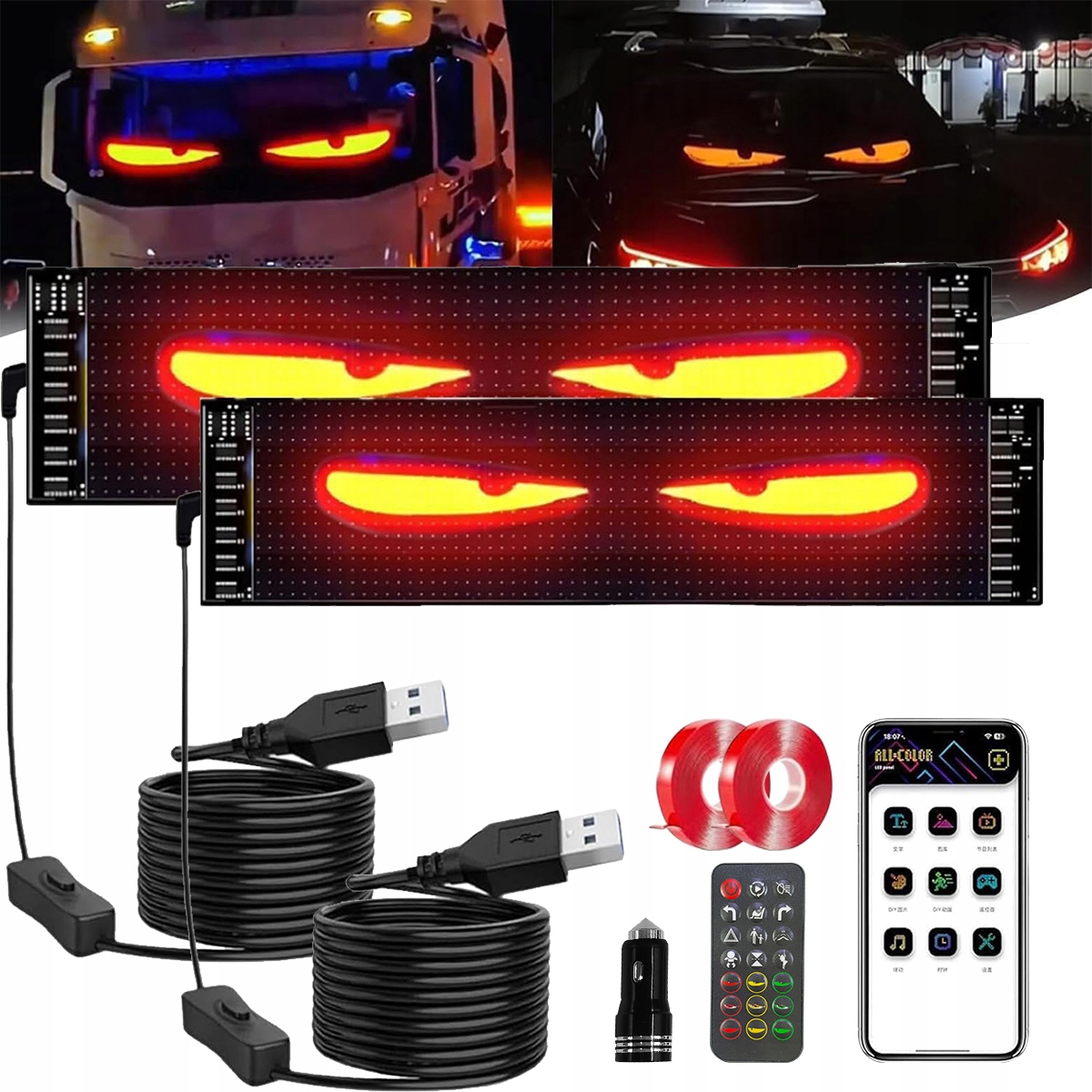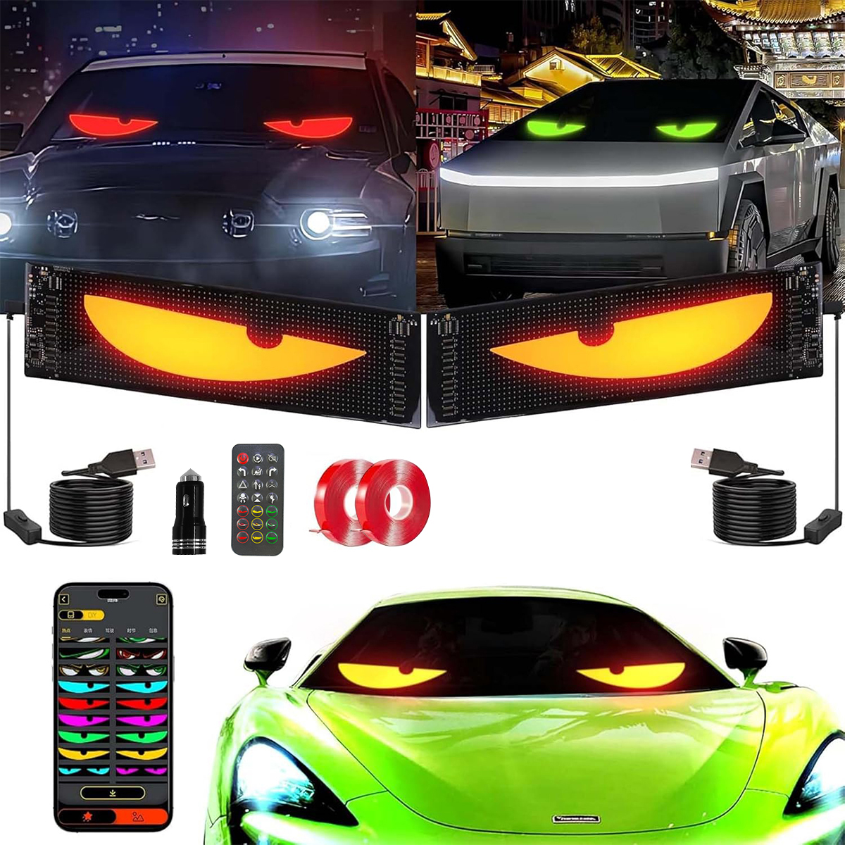 набор из 2 дьявольных глаз для автомобилей, светодиодные глаза для грузовиков, гибкий светодиодный экран, светодиодный дисплей, программируемая неоновая светодиодная марка, персонализированный знак автомобиля с освещенным платой, грузовики, текст, граффити | Bluetooth, интеллектуальное управление приложениями/пульт дистанционного управления, USB 5 В/2 A