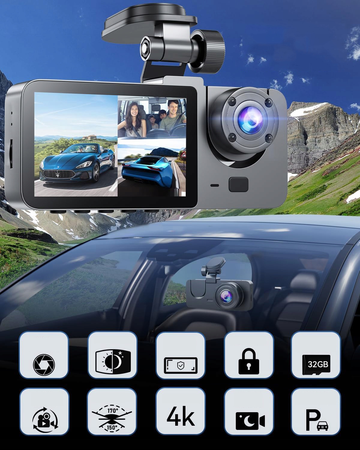 Автомобильная камера передняя и задняя 4K Full HD, автомобильная камера, включенная с SD-картой 32 ГБ, 3-канальной автомобильной камерой, автомобильной камерой с ночным козырьком, датчиком G, режимом парковки 24 часа, широкий угол 170 °, записывая в петле