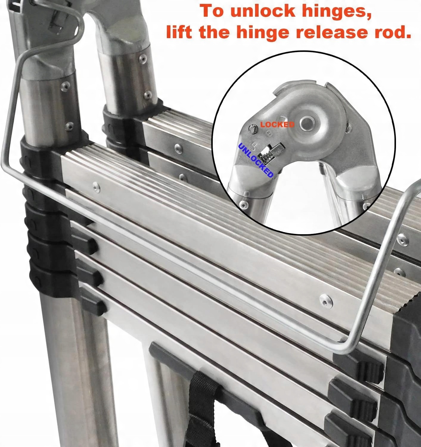 Телескопическая лестница с А-образной рамой: выдвигается до 3,8 м, легко выдвигается и убирается; В сложенном виде его легко хранить; Может использоваться как прямая лестница или лестница с А-образной рамой (1,9 м + 1,9 м);