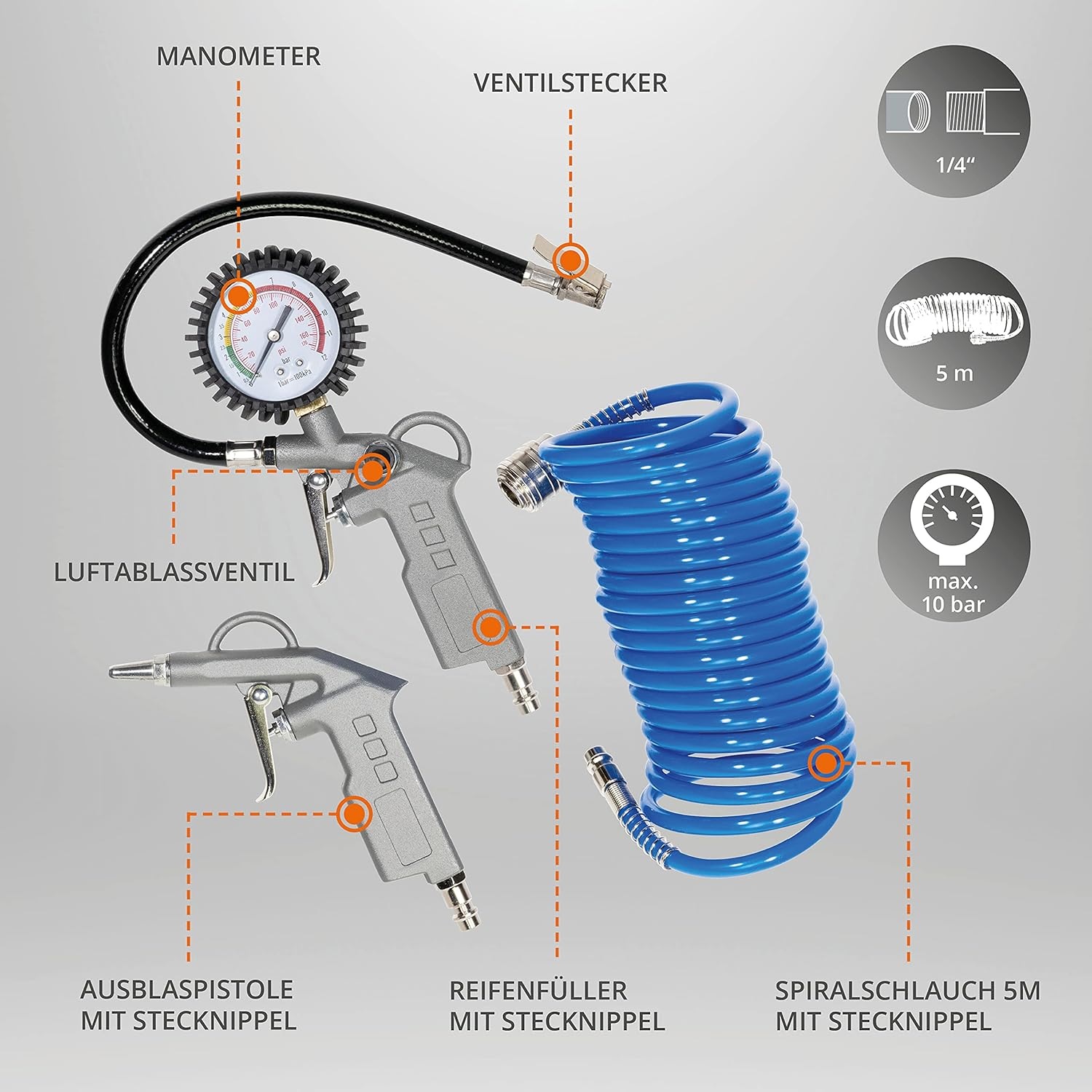 Pistol для продувки с помощью Pistol For For Tries разъем подключения, 5 -метровый спиральный шланг с разъемом для подключенияФункции продукта