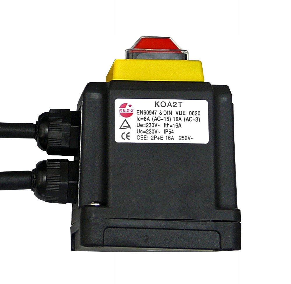Трёхфазный выключатель со вилкой и кабелем. Выключатель имеет реле, которое защищает от автоматического запуска двигателя и отключает двигатель в случае сбоя питания.