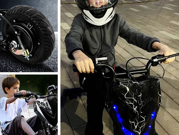 Большим преимуществом этого автомобиля является электрический привод на переднее колесо и полностью поворотный задний мост. Спереди имеется резиновая шина, а сзади два полиуретановых ролика, которые можно вращать на 360 градусов. Вращение вокруг своей оси не является проблемой, что доставляет массу удовольствия. Бесщеточный электродвигатель максимальной мощностью 250 Вт и скоростью до 15 км/ч обеспечивает достаточную скорость и максимальное удовольствие от вождения. Ваш ребенок может ускоряться медленнее и быстрее и поворачивать на максимальной скорости, соответствующей его способностям.