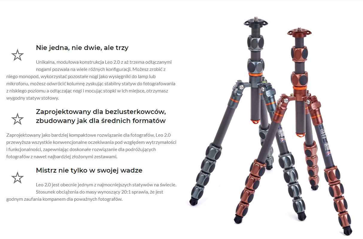 Leo 2.0 — чрезвычайно компактный профессиональный штатив для путешествий с беспрецедентным уровнем функциональности и возможностей. Вдохновленный своим предшественником, обладателем престижной технической премии Люси, он является его продолжением в еще лучшей форме. Leo 2.0 был переработан, чтобы удовлетворить потребности каждого путешествующего фотографа, выходя за рамки стандартного разделения на компактные туристические штативы и профессиональные штативы и объединяя их функции в одном.