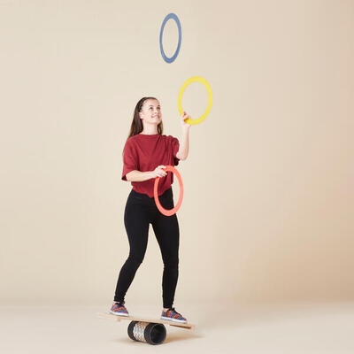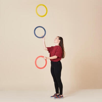 Чтобы понять механику жонглирования тремя предметами, рекомендуется сначала научиться жонглировать мячами. Затем просто отрегулируйте чистку и ловлю в соответствии с геометрией обруча. Держите и бросайте обручи вертикально. Ваши руки должны обхватывать край обруча. Вы можете посмотреть наши обучающие видеоролики на канале DECATHLON Gymnastics на YouTube.