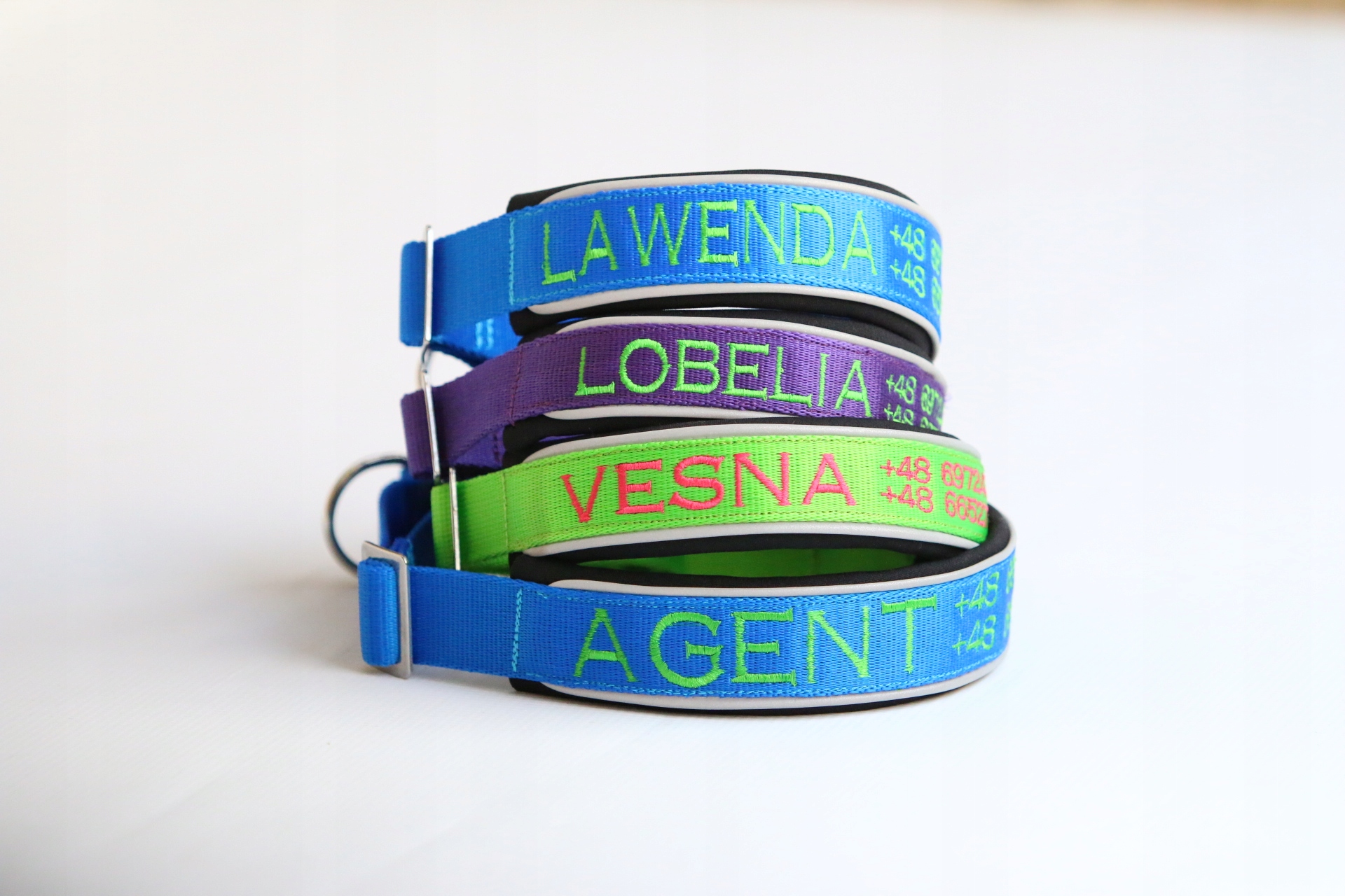 Возможно приобрести воротник с вышивкой – это постоянный способ его маркировки. Он делается прямо на ленте, а не на какой-то заплатке или булавке. Это может быть любой текст или число – или и то, и другое! Имя собаки, название породы, клуба, компании или группы, а также номер телефона, благодаря чему ошейник становится неразрушимым идентификационным ярлыком. Вышивка точно не сотрется и не потеряется в кустах! Ошейники с вышивкой можно приобрести и на других наших аукционах.