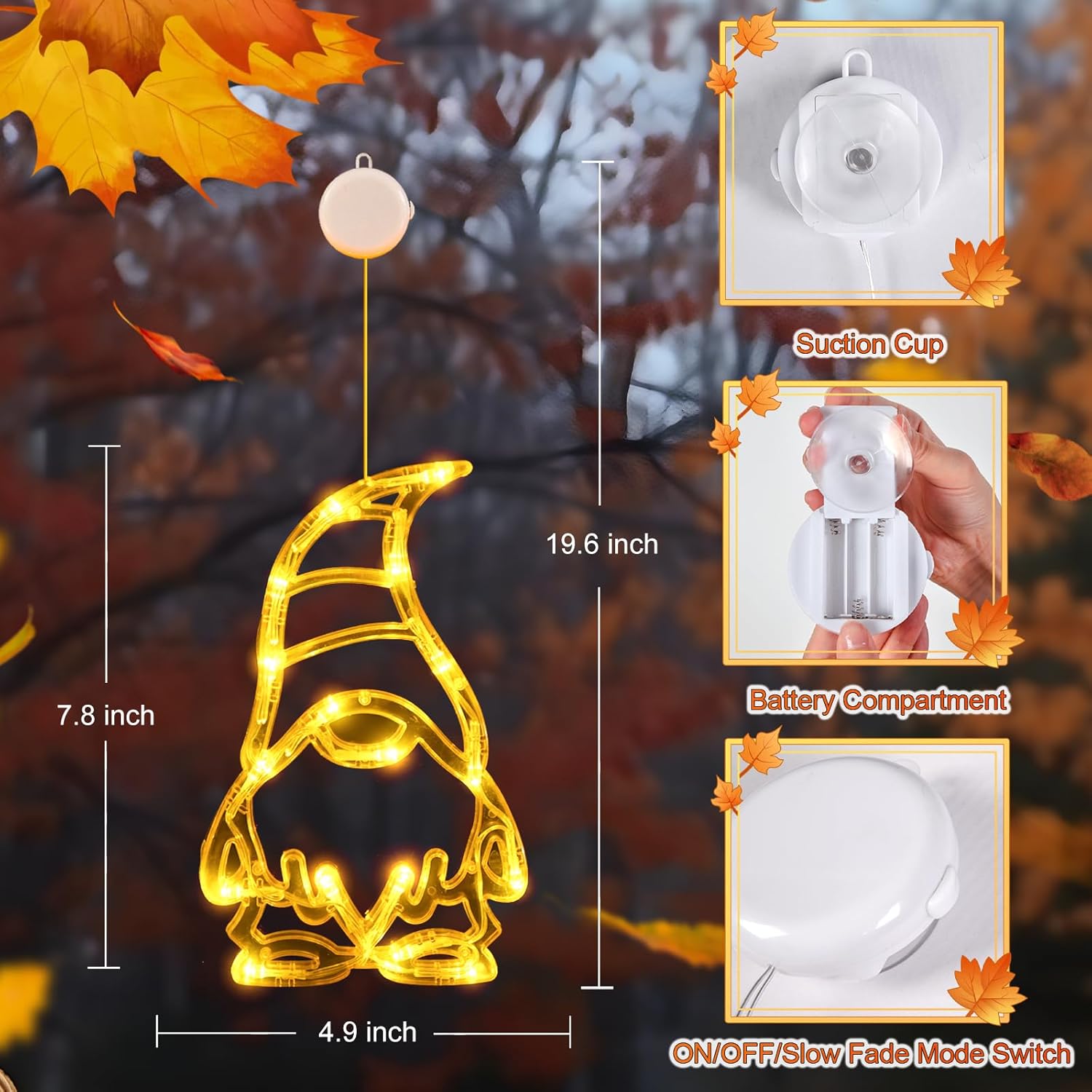 - Улучшите свои рождественские и новогодние украшения с помощью нашего набора из трех подвесных светодиодных оконных светильников. Каждый светильник креативно разработан в форме оранжевого, красного и желтого гномов, что добавляет причудливости вашим рождественским окнам в стиле Хэллоуина. Оконные украшения имеют диаметр 19,8 см, а высота нити - 49,8 см, поэтому они привлекают внимание, не загромождая пространство окна.