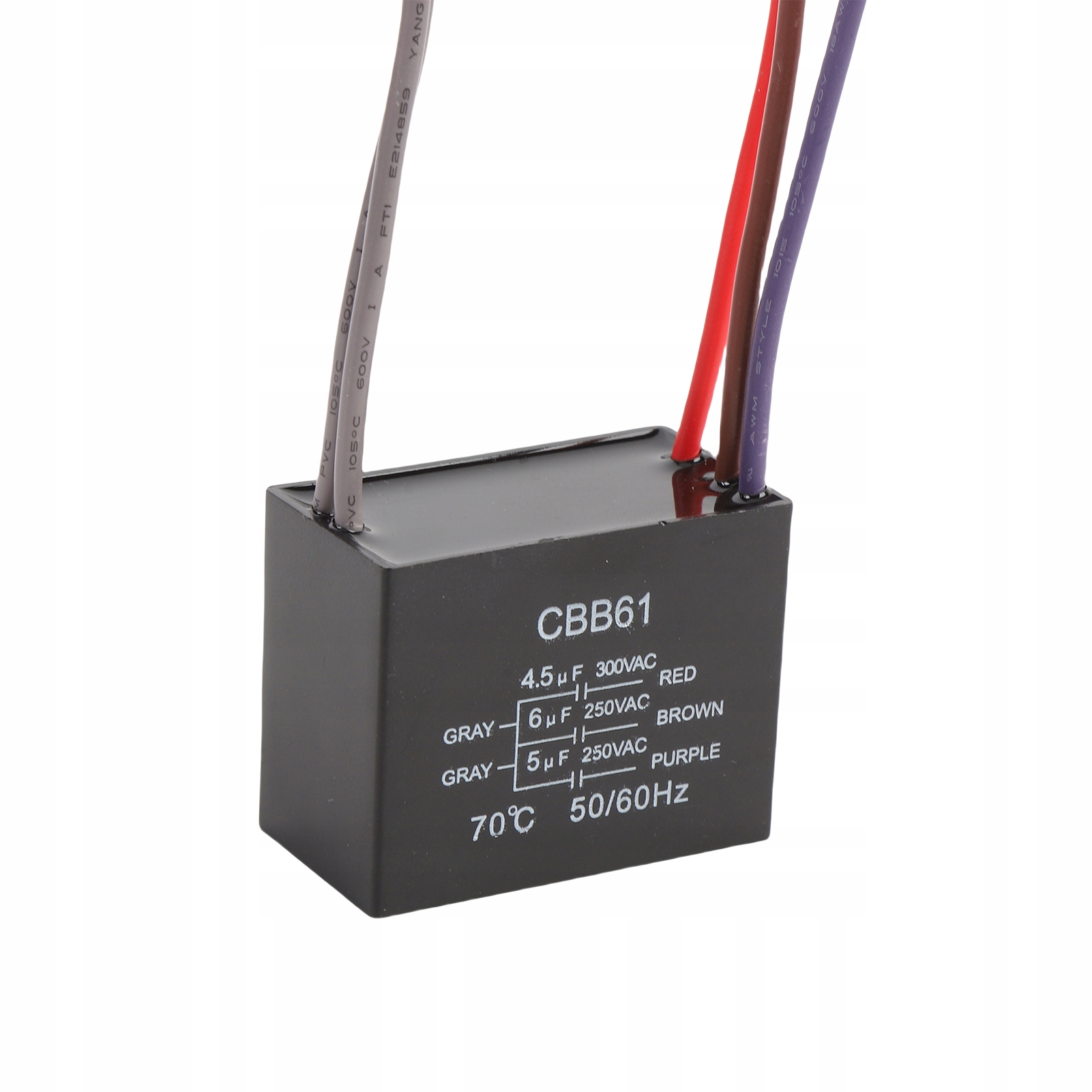 2. Конденсатор CBB61: 5-проводной конденсатор CBB61 рассчитан на 4,5 мкФ, 6 мкФ и 5 мкФ. Поддерживая частоту 50-60 Гц и максимальную рабочую температуру 70°C, этот конденсатор идеально подходит для обеспечения эффективной работы потолочного вентилятора.