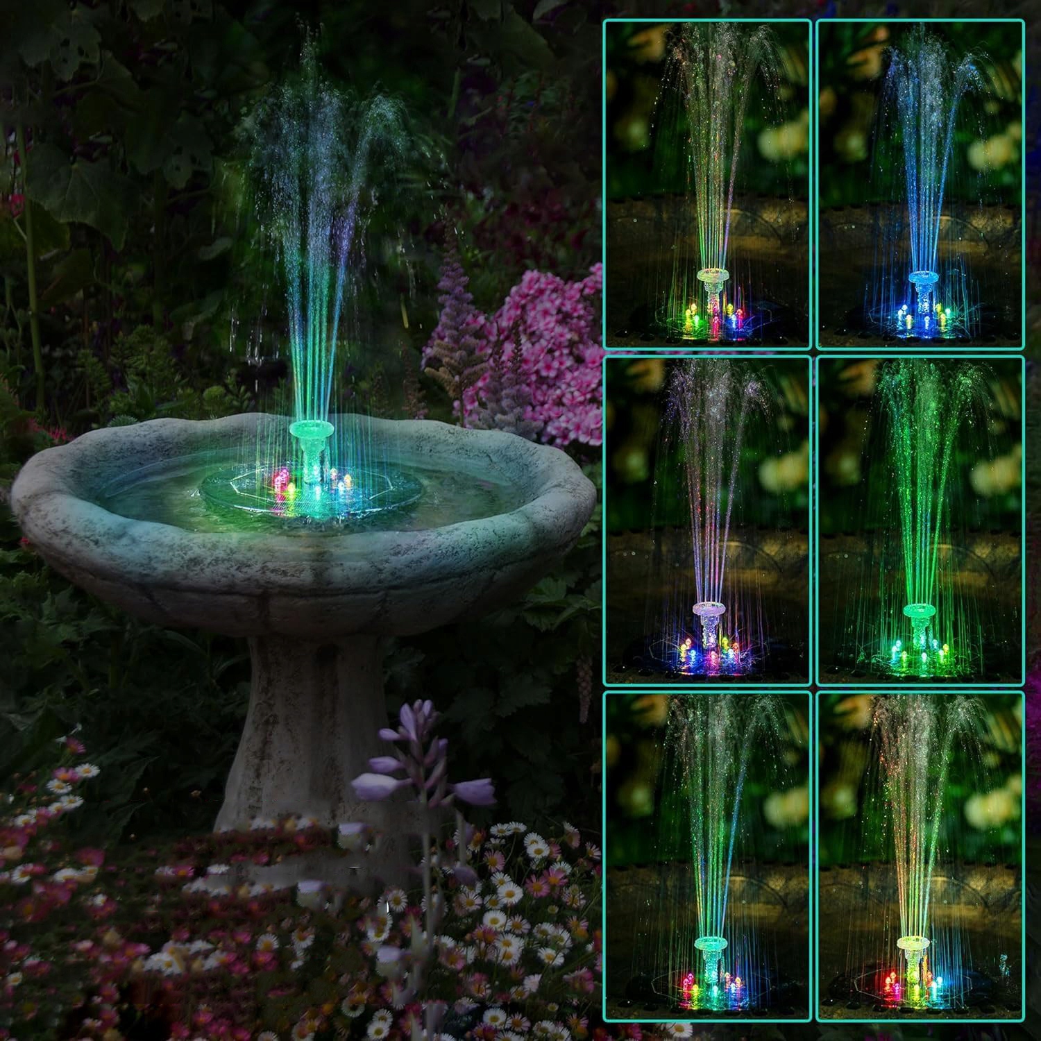 Солнечный фонтан оснащен аккумулятором 1500 мАч , который заряжается в течение дня, поэтому он не требует внешнего источника питания и может распылять и освещать до 3-4 часов даже ночи. 8 Красочные светодиодные огни с высокой яркостью делают ваш сад красивее ночью.