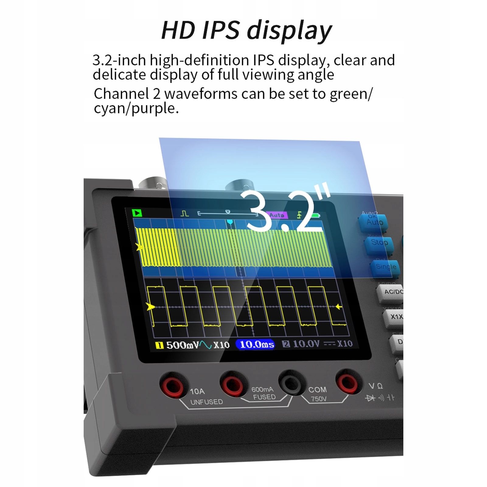 Функция: 1. 3 в 1 конструкциях с экраном IPS: этот продукт интегрирует цифровой осциллограф, мультиметр и генератор сигналов в одном устройстве. Прозрачный экран IPS с 3,2 -дюймовым диагональным, полным видом высокой чувствительности, канал 2 может быть установлен на зеленый, голубой и фиолетовый.