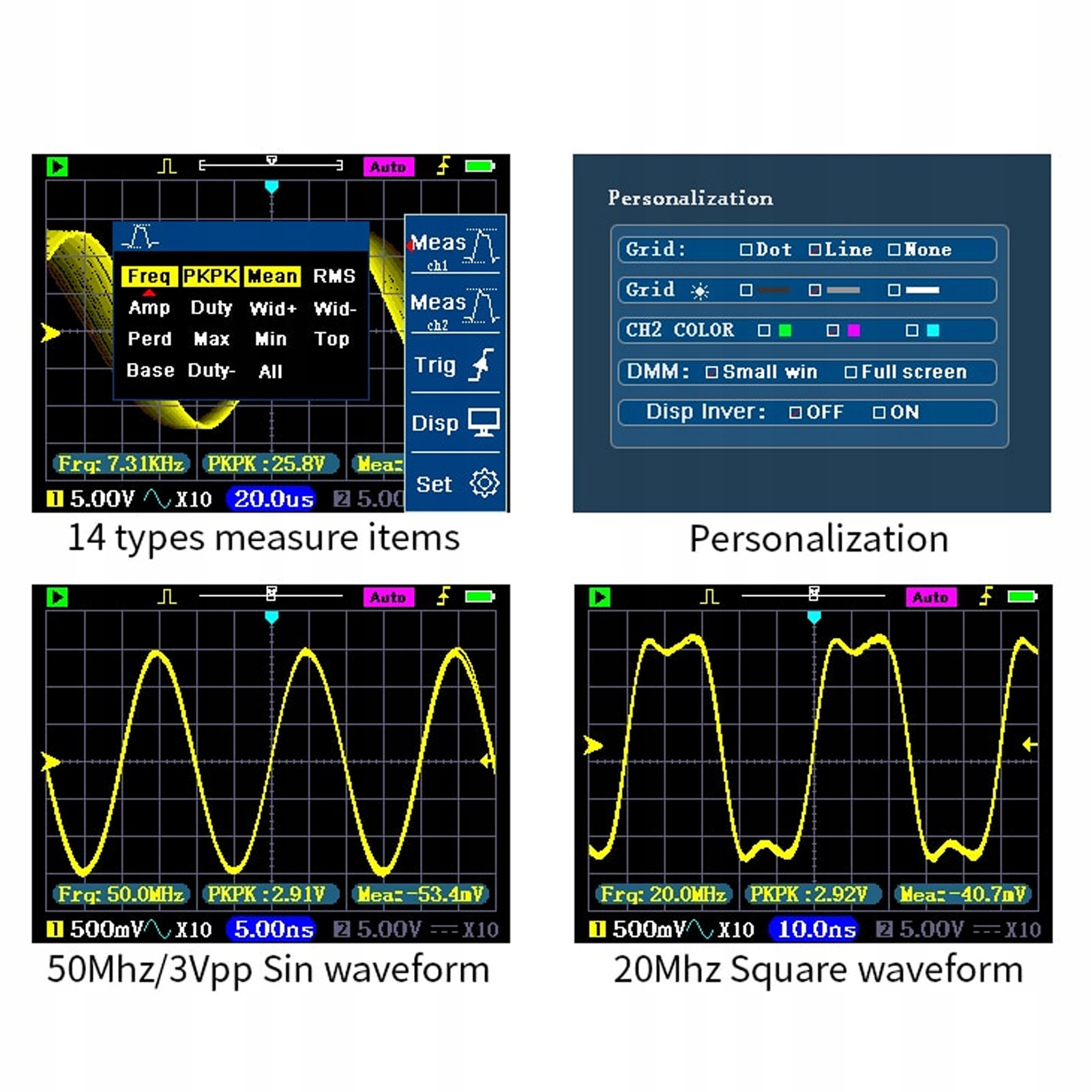 Функция: 1. 3 в 1 конструкциях с экраном IPS: этот продукт интегрирует цифровой осциллограф, мультиметр и генератор сигналов в одном устройстве. Прозрачный экран IPS с 3,2 -дюймовым диагональным, полным видом высокой чувствительности, канал 2 может быть установлен на зеленый, голубой и фиолетовый.