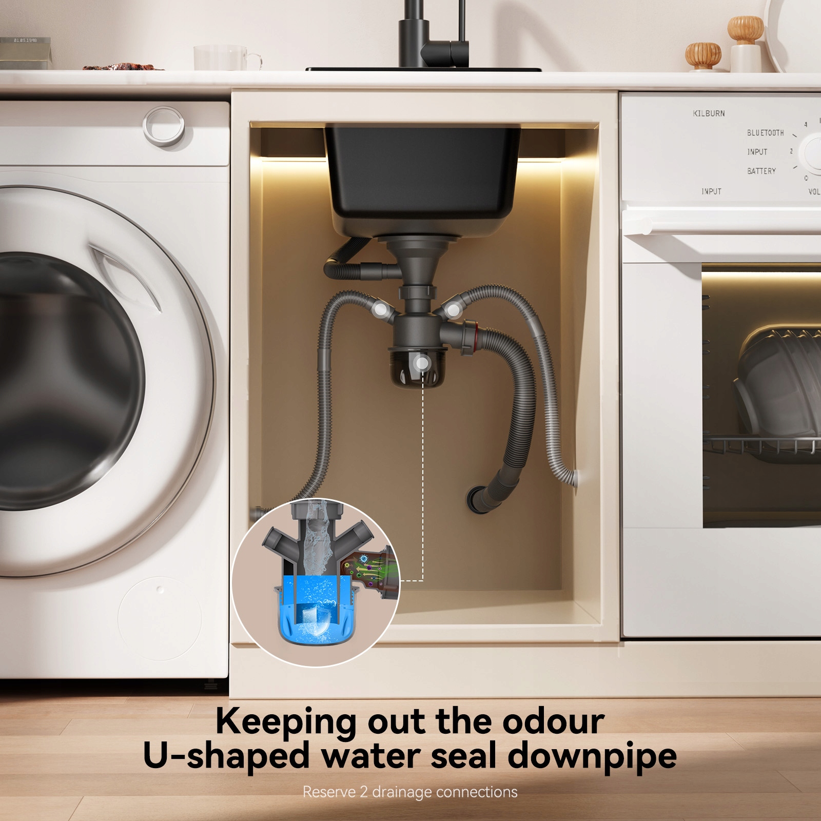 5. Сливная труба имеет гидрозатвор, препятствующий появлению запаха. Используя физические принципы, она изолирует неприятные запахи и насекомых, предотвращая распространение запахов и проникновение насекомых в дом через трубы. Сливная труба имеет удобную конструкцию с несколькими соединениями и двумя предварительно установленными портами, что позволяет одновременно подключать кухонные приборы, такие как посудомоечные машины.