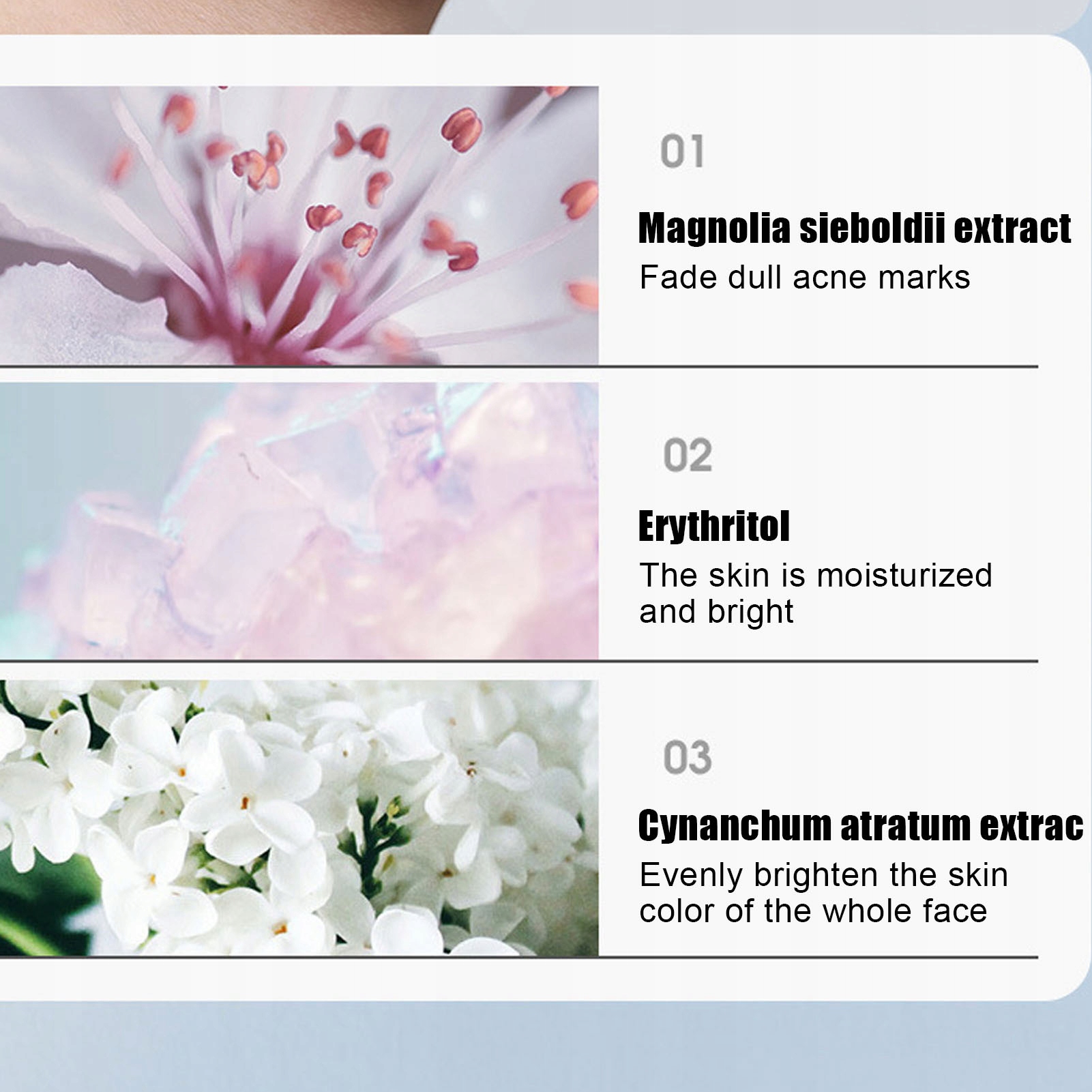 1, Натуральные ингредиенты: сыворотка лица состоит из натуральных ингредиентов, включая магнолию сиболдий, эритритол и экстракт атратум Cinnanchum. Эффективно осветляет.