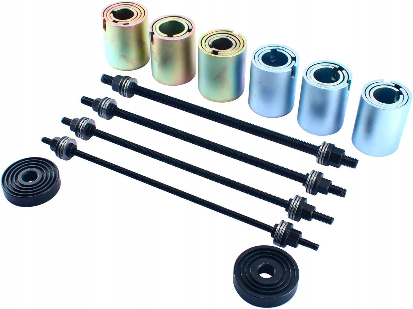 Комплект из 20 втулок для запрессовки/запрессовки металлорезиновых втулок на автомобиле без необходимости демонтажа поперечных рычагов и балок.Комплект может использоваться на гидравлическом прессе или протяжном приводе.