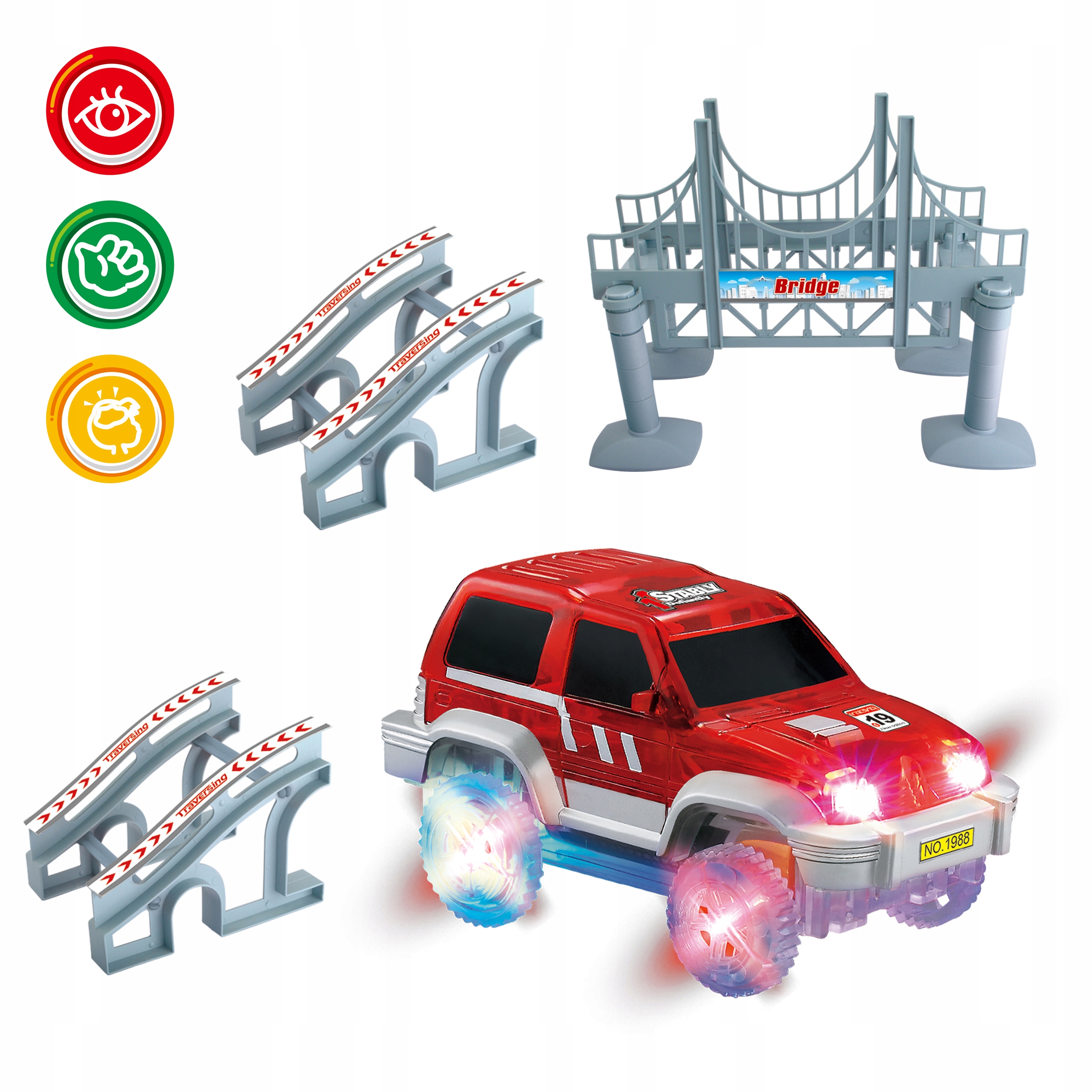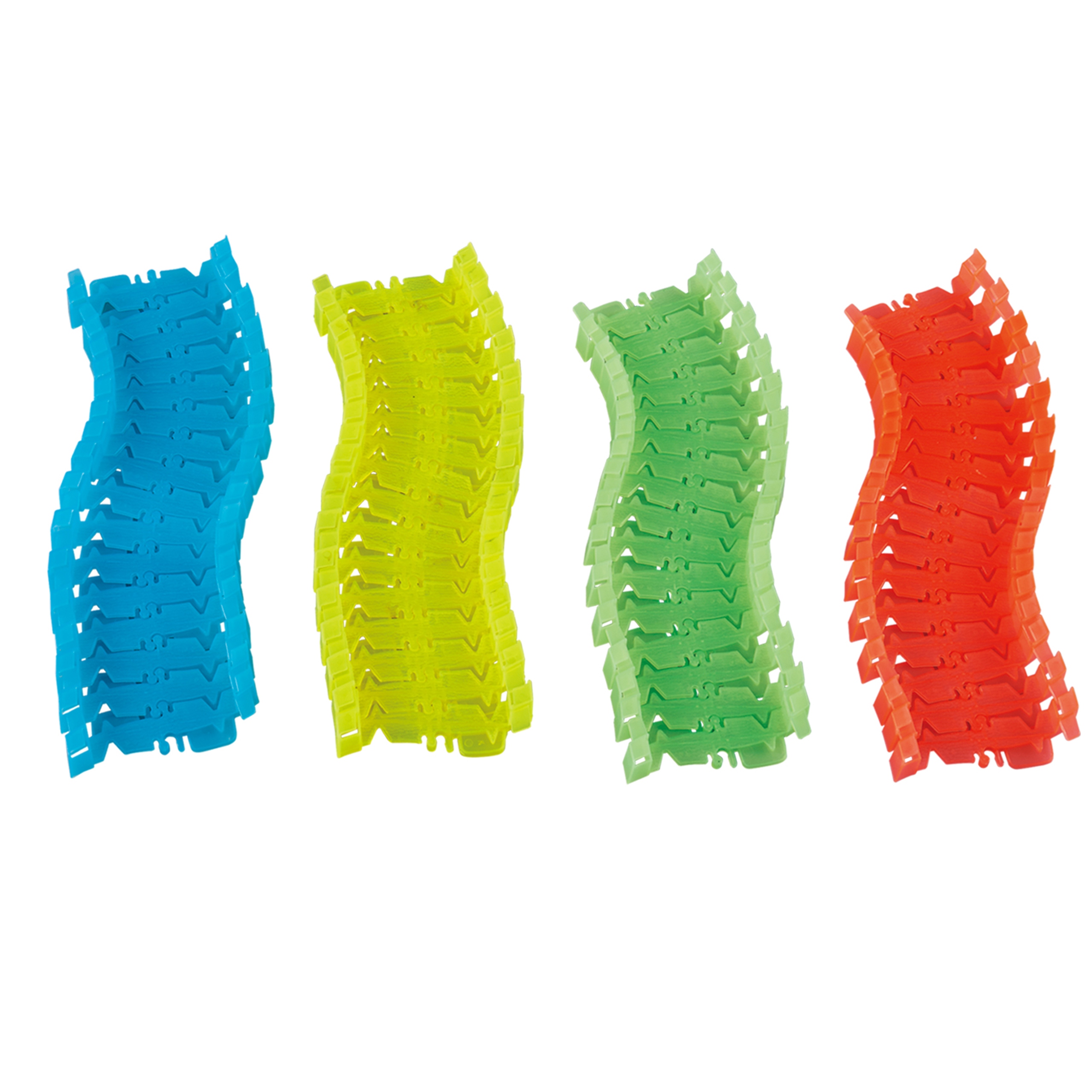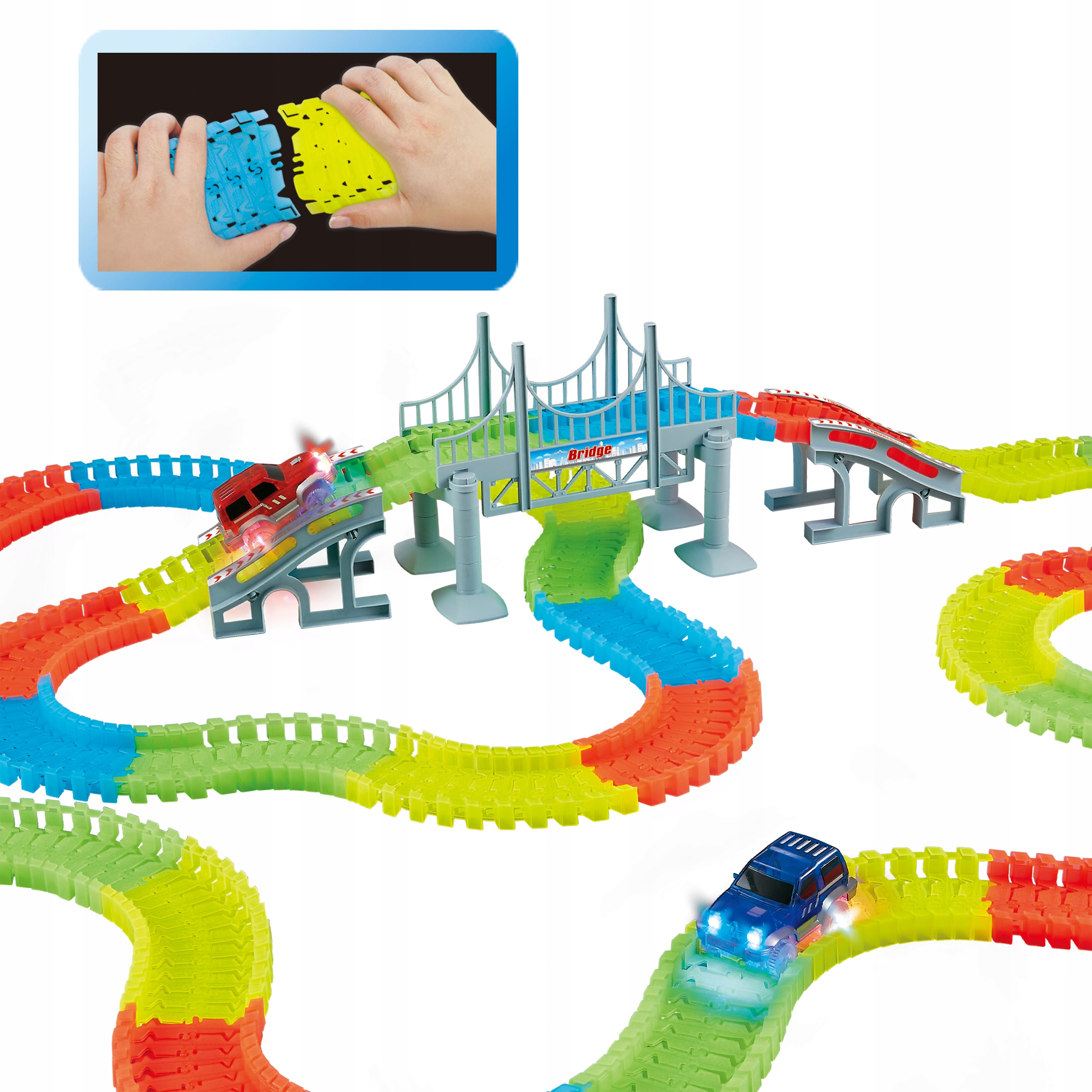 Автомобильная трасса доставит вашему ребенку много часов удовольствия. Благодаря высокой гибкости элементы гусеницы можно перемещать, поворачивать, поднимать, менять направление движения и компоновать в любой комбинации. Каждый элемент направляющей является съемным, поэтому его легко собирать и разбирать. В темноте, под воздействием света движущегося автомобиля, дорожка выглядит как будто светящейся. Играя, ребенок может развивать навыки ручного труда, конструирования и творчества.