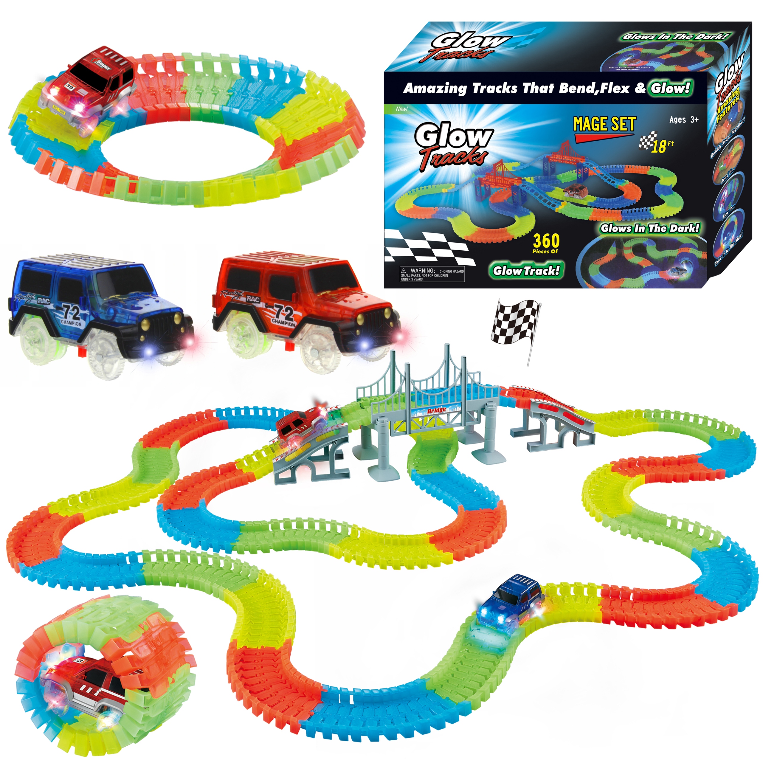 В комплект входят 2 светодиодные машинки, работающие от батареек АА, езда в темноте дает потрясающий эффект, а трассы выглядят фантастически.