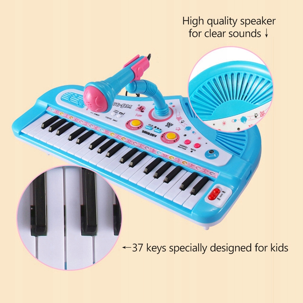 Функциональность: фортепиано имеет 37 клавиш, 24 мелодии, 8 мелодий ударных и 4 звуковых эффекта, регулируемых с помощью кнопки.