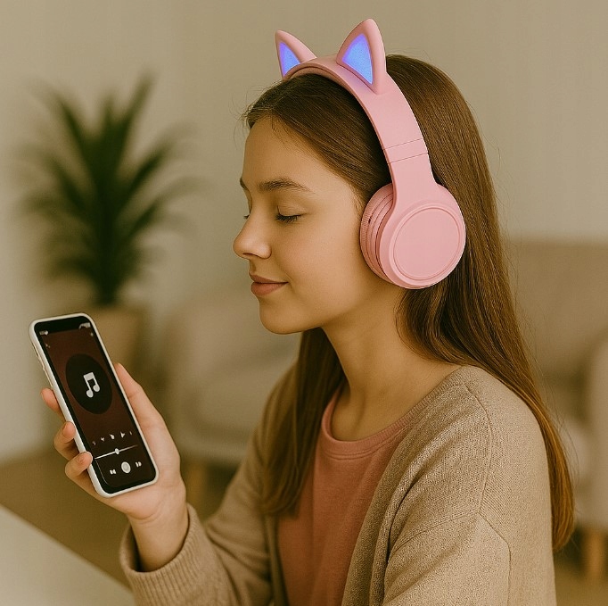 Розовые наушники с очаровательными кошачьими ушами - отличный компаньон повседневного расслабления. Они предлагают музыку, воспроизводимую Bluetooth, кабель Micro-Jack или SD-карту. У них есть удобная структура складывания и кнопки на корпусе, что облегчает работу даже самых молодых пользователей.