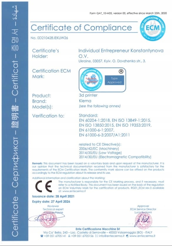 Покупая принтер KLEMA 250 Twin в Центре 3D Печать, мы предоставляем:
