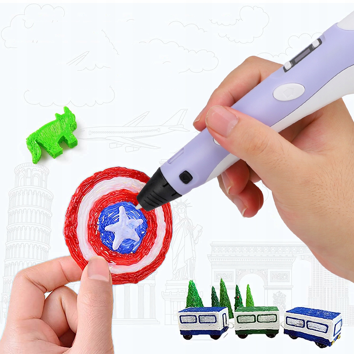 - Дай волю своему воображению. 3D-ручка выдавливает нагретый пластик, который мгновенно затвердевает и позволяет рисовать в 3D без помощи рук или с помощью трафарета.