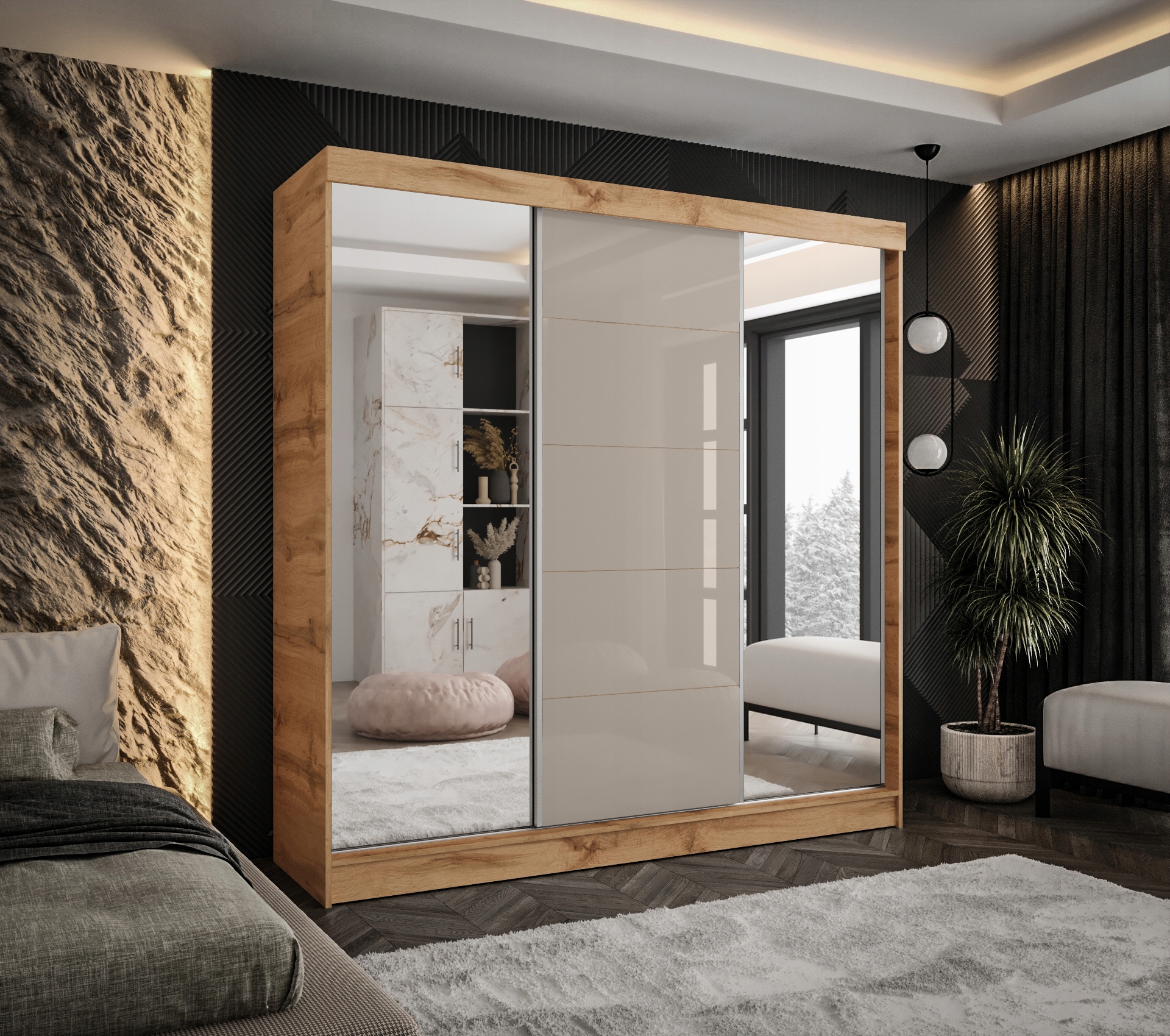 Шкаф-купе цветной Сонома дуб с отделкой центрального фасада с черным Lacobel и зеркалами по бокам – это стильное сочетание естественного характера дерева и современной элегантности. Светлый, теплый оттенок дуба Сонома привносит в интерьер уют и легкость, а блестящий черный лакобель придает мебели выразительность и роскошь