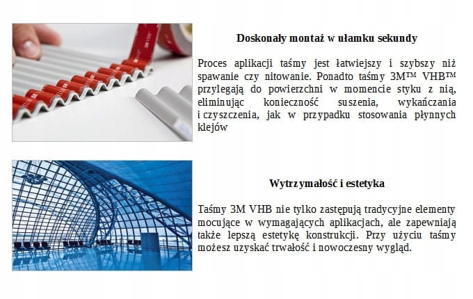 Ленты 3M VHB позволяют точно воспроизвести конструкцию на практике, устраняя неприглядные видимые соединения, такие как винты и болты. Эти высокопрочные двусторонние ленты из акриловой пены позволяют быстро и легко создать прочное соединение, которое со временем становится еще более прочным. Ленты сочетают в себе различные материалы, в том числе: алюминий, сталь, стекло, пластик, окрашенные и порошковые поверхности, обеспечивающие гибкое соединение любых материалов.
