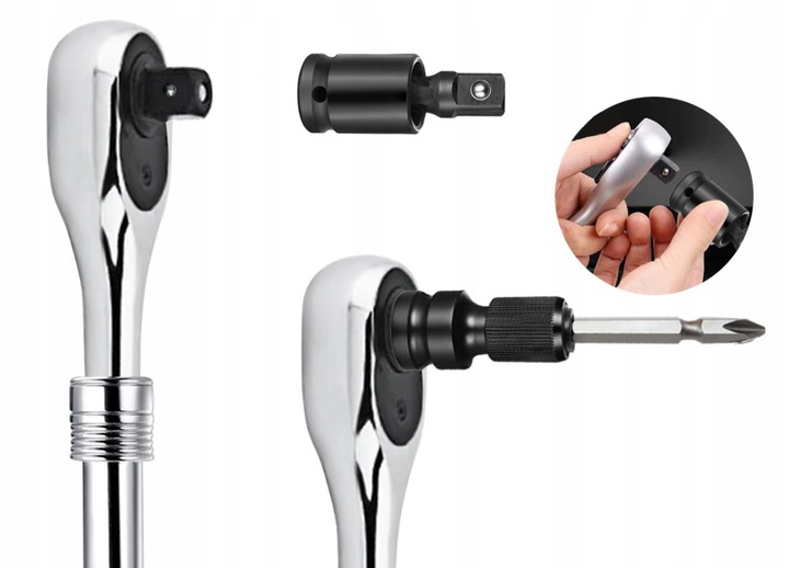 В комплект входят три шарнира разных размеров: 1/4", 3/8" и 1/2", что позволяет гибко адаптировать его к различным применениям и инструментам.