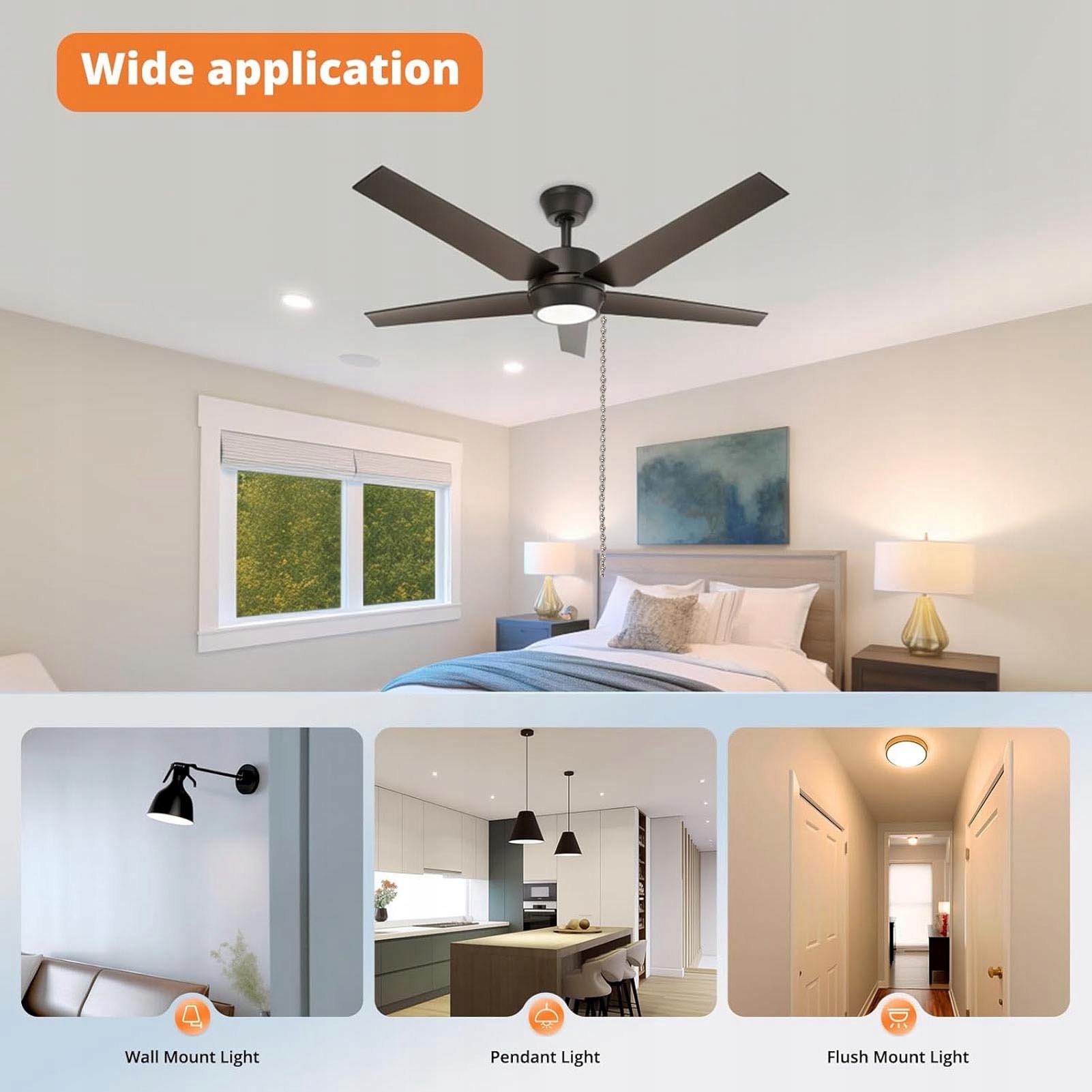 4. [Цепной переключатель] Запасная панель светодиодного потолочного вентилятора оснащена 1-футовым цепным переключателем, вы можете напрямую потянуть его, чтобы управлять светом.