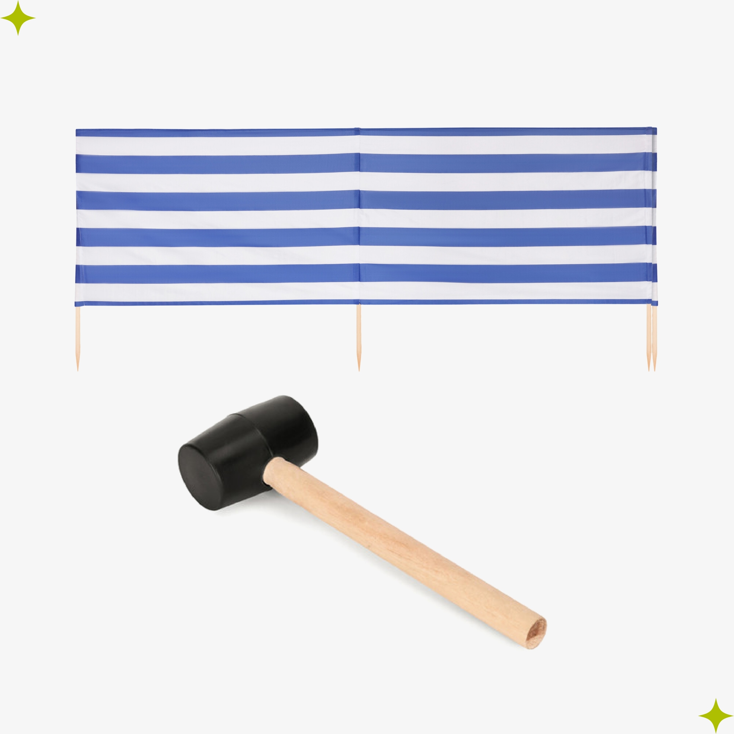 • Высота: 77 см - идеально подходит для удобного отдыха • Летний дизайн, полный цветов - узоры, вдохновленные прибрежным климатом: - парусные лодки, якоря, морские лошади - пресноводные арбузы, радуга - Белые и синие полосы в морском стиле • Деревянная рама - сплошные, натуральные столбы, чтобы въехать в песок • Резиновый молоток в наборе - облегчает быстрое и удобное расстояние экрана
