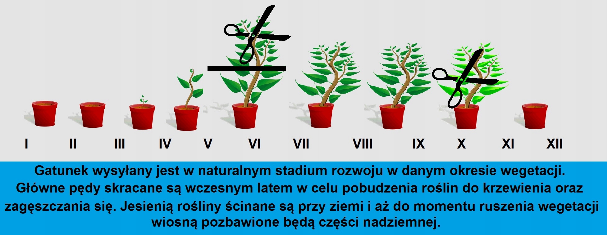 В целях безопасности и обеспечения здоровья растений и их хорошего состояния после получения груза саженцы перед отправкой обрезаются на высоту 30-40 см с весны до поздней осени. (сентябрь-ноябрь). Саженцы, заказанные позже, до начала вегетации (V), лишены надземной части!